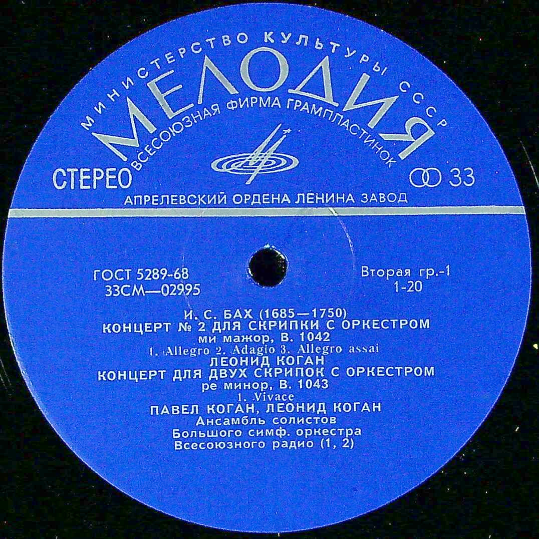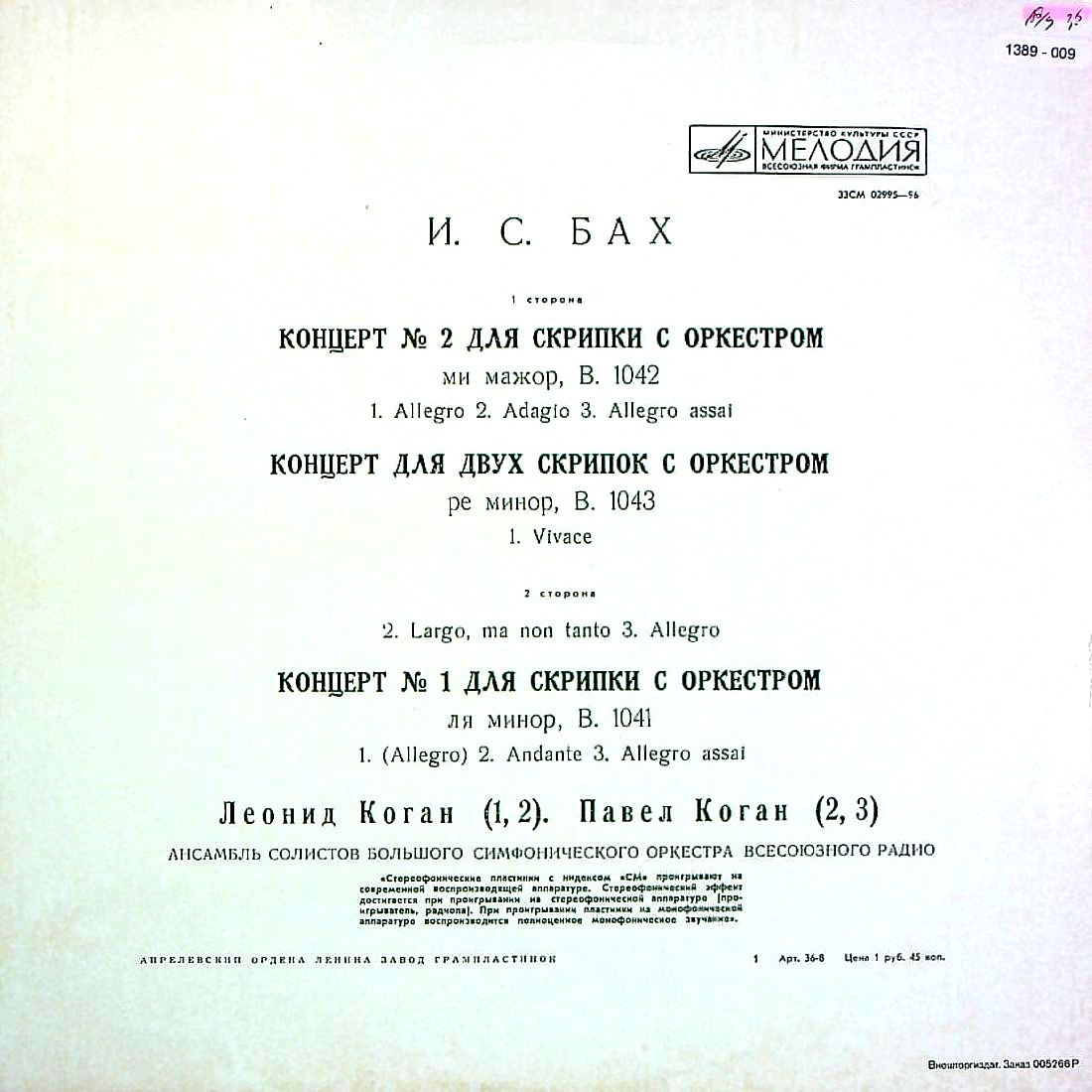 商品コード:1389-009t[MELODIYA] L.コーガン(vn)/P.コーガン(vn)/ バッハ:Vn協奏曲1番BWV.1041, Vn協奏曲2番BWV.1042, 2Vn協奏曲BWV.1043