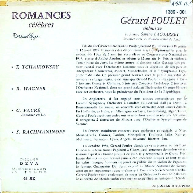 商品コード:1389-001[DISQUES DEVA] G.プーレ(vn) / ロマンス集/チャイコフスキー, ワーグナー, フォーレ, ラフマニノフ
