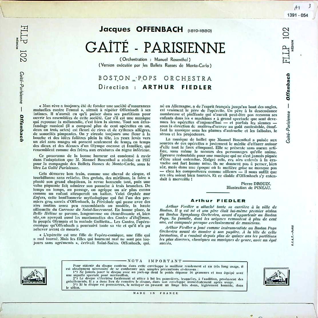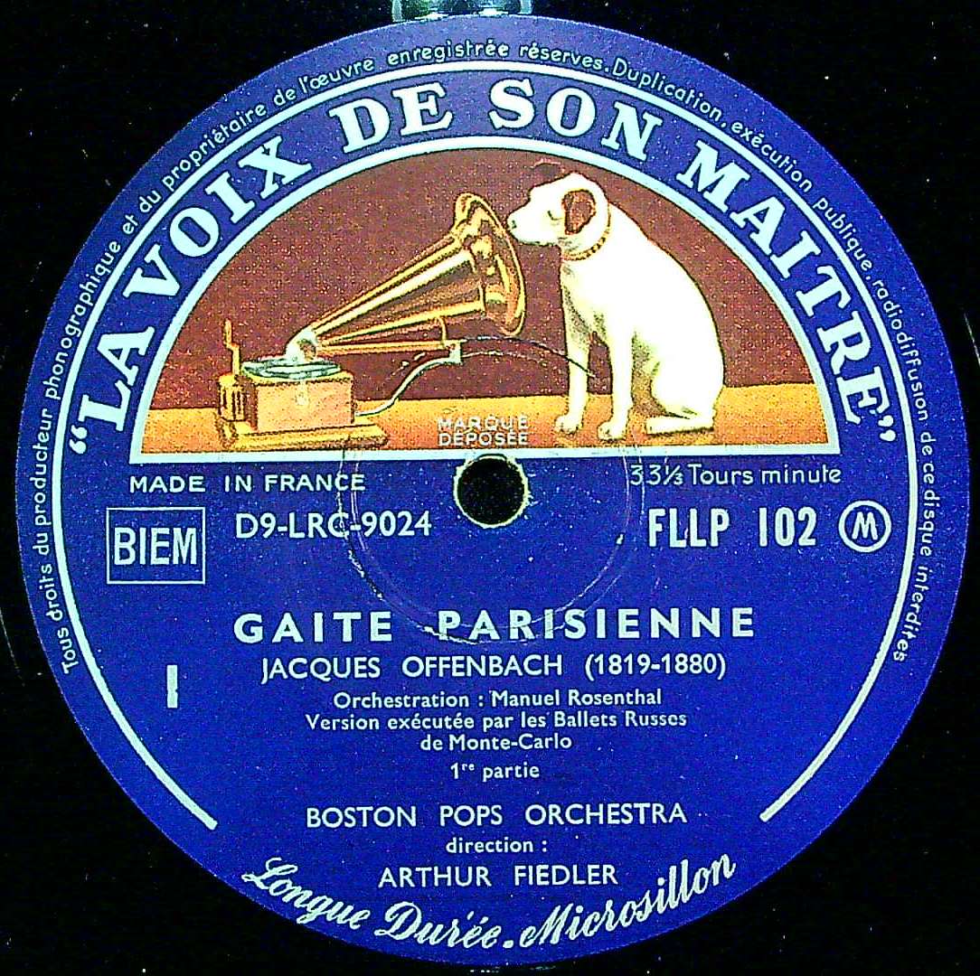 商品詳細:オッフェンバックのバレエ音楽「パリの喜び」のフルバージョン。録音は多くない。この曲はオッフェンバックのオリジナル作品ではなく、オッフェンバックの死後(1938年)に、マニュエル・ロザンタールという作曲家がオッフェンバックの有名曲を繋ぎ合わせてバレエ用に編曲した編集作品である。次から次へと彼の闊達なメロディーが登場し、終盤のカンカン・メドレーまで圧巻の名曲オンパレード。オッフェンバックの有名なメロディーを堪能できる組曲風作品となっている。少々通俗的である事から純クラシックとみないレーベルもあり、La Voix De Son Maîtreでもソフト・クラシック扱いでFALP ***ではなくFLLP ***番号でレーベルカラーも紫色である。元曲は全てオペレッタなので通俗性は否めない。日本でもバレエの発表会や吹奏楽などでよく使用される曲らしい。全20曲構成らしいが、LP時代は抜粋盤が普通らしい。先頭の序曲は「パリの生活」:トゥルネ・トゥルネと手袋屋ガブリエルの歌を使っている。他美しきエレーヌ、ホフマン物語、地獄のオルフェ等の有名曲からの抜粋曲が多数ある。ここでの演奏はボストン・ポップス・オーケストラで指揮者はアーサー・フィードラー(1894 - 1979)が担当。マサチューセッツ州ボストン生まれの指揮者で1915年には、ボストン交響楽団(当時の指揮者はカール・ムック)にヴァイオリニストとして入団している。1924年に交響楽団のメンバーによる室内楽団ボストン・シンフォニエッタを立ち上げ、無料の屋外コンサートを始めるようになる。1930年にはボストン・ポップス・オーケストラの第18代指揮者に就任し、半世紀にわたってその職を務めた。フィードラーの元でボストンポップスは多くのレコーディングを行い、レコード、カセットなど音楽ソフトの総売上はどこのオーケストラよりも多い5000万ドルを記録している。フィードラーはまた、サンフランシスコ・ポップス・オーケストラで夏場に26回の共演を果たすなど世界各地のオーケストラを指揮している。来日もあり、日本にも熱狂的ファンがいるらしい。「パリの喜び」の演奏にはぴったりと思われる。これは1947年初回SP録音のフランス盤!1958年にモノラル/ステレオで再録音した。
