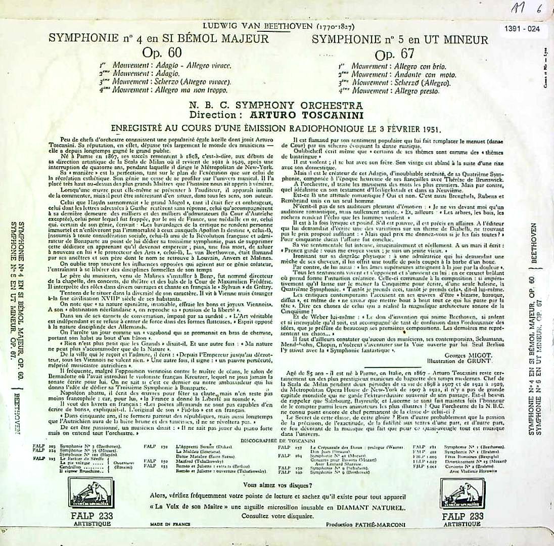商品詳細:4番は5種ある中、最後の1951年2月3日、カーネギーホールでの録音。1939年BBCso.も名演で知られる。4番は米RCA・LM 1723/HMV:ALP 1145、5番は1952年3月22日、カーネギーホール録音でLM 1757/ALP 1108でも出ている。フランス盤は米国RCA/英HMVとカップリングが異なり4/5番の組み合わせである。後に出たフランスRCAプレスも4/5番という組み合わせ。Pathéプレスの音質は柔らかく大変良い。米国RCAの乾いた強い音質ではない。フルトヴェングラーと対極にあるテンポ感の強い秀演!フルトヴェングラーと対極にある現代のスタイルの元となった演奏!フランスでは1956年頃からカップリング違いで仏RCAレーベルからも平行発売される(4/5番は同じ)。同じEMI系では英国からもALP番号で発売されるが、音質はそれぞれの国の特長が出る。フランス盤はパワーのある押し出しが強い音質である。全集を揃える場合はEMI系とRCA系を混ぜないように、また国を揃えることが早道でダブりが出ない最良の方法である。特別な希少プレスではないので5年あれば、同一シリーズで揃えることができると思われる。トスカニーニとフルトヴェングラーという2つの柱がいつの時代でも比較されるが、どちらも優劣の付けられない名演と信じる。但し指揮者の系譜から考えると、フルトヴェングラーは一代限りのスタイルであり、トスカニーニは彼以降全ての指揮者の源流ということができる。両者の人気の度合いは時代の背景で異なり、不況になるとトスカニーニが注目されるようになることが経済学者から指摘されている。