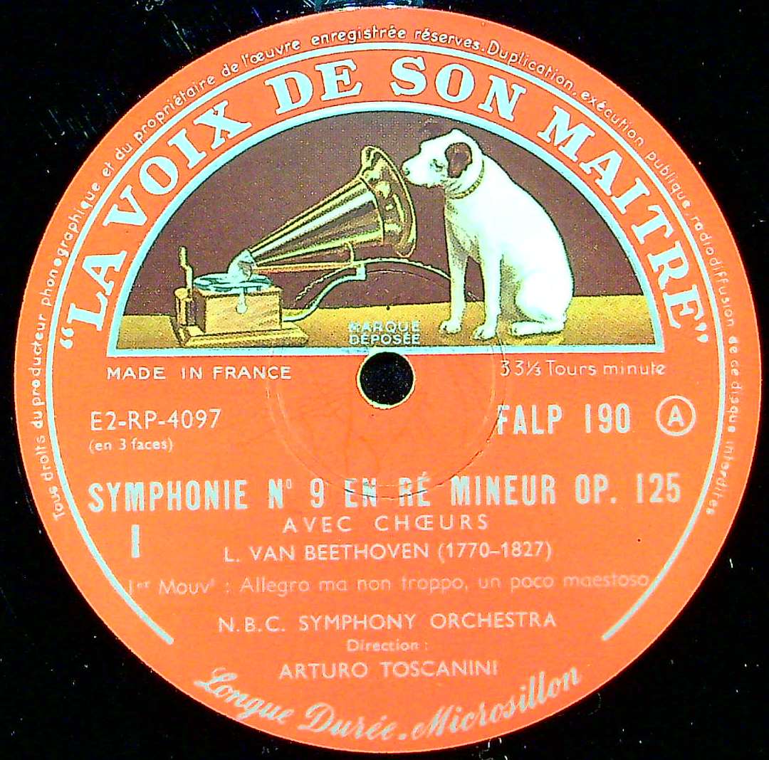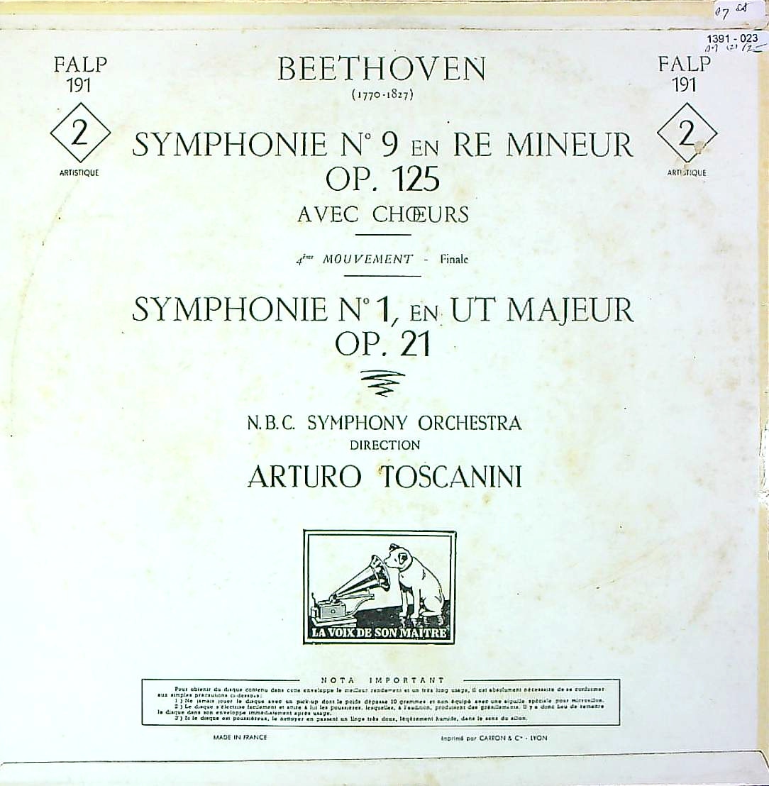 商品詳細:トスカニーニの第9の仏初版。極厚重量盤。バラ2枚と箱入りの2種が存在する。重低音がズンと響く迫力の音で、英プレスより押し出しが強く、音が貧弱だというクレームはまず出ないだろう。1950年前後の録音にしては音がはっきりとしていて、彼のスピード感のあるテンポがよく生きた演奏。最近、話題にならないトスカニーニの再評価のサンプルになりえる。フルトヴェングラーと対極にある現代のスタイルの元となった演奏!大局的に見るとフルトヴェングラーのスタイルは一代限りの唯一無二のものだったが、トスカニーニのスタイルは形を変えて現代まで引き継がれているというのは間違いではないだろう。フランスでは1953年交響曲1+9番でFALP 190-1で発売されたが、同年末には交響曲8+9番・FALP 236-7でも出ている。この場合交響曲9番は番号の早いFALP 190-1を初出とする。また1956年頃からカップリング違いで仏RCAレーベルからも平行発売される。仏RCAでは8+9番のカップリングだけである。1番は2番とのカップリングになる。同じEMI系では英国からもALP番号で発売されるが、音質はそれぞれの国の特長が出る。フランス盤はパワーのある押し出しが強い音質である。全集を揃える場合はEMI系とRCA系を混ぜないように、また国を揃えることが早道でダブりが出ない最良の方法である。特別な希少プレスではないので5年あれば、同一シリーズで揃えることができると思われる。トスカニーニとフルトヴェングラーという2つの柱がいつの時代でも比較されるが、どちらも優劣の付けられない名演と信じる。但し指揮者の系譜から考えると、フルトヴェングラーは一代限りのスタイルであり、トスカニーニは彼以降全ての指揮者の源流ということができる。両者の人気の度合いは時代の背景で異なり、不況になるとトスカニーニが注目されるようになることが経済学者から指摘されている。