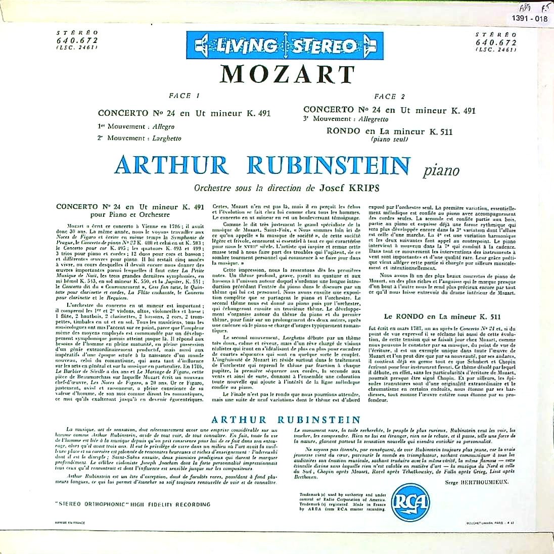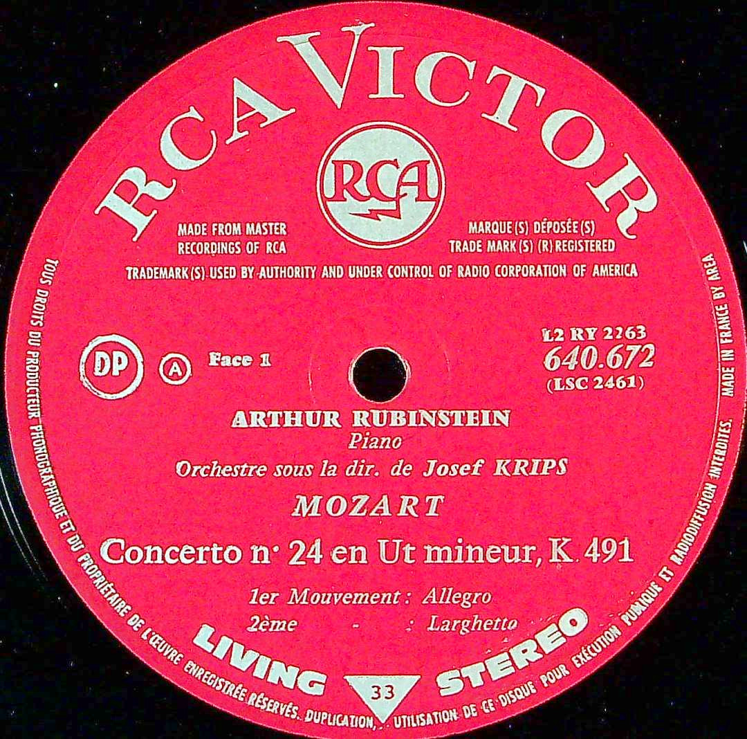 商品コード:1391-018[RCA] A.ルービンシュタイン(pf) / モーツァルト:Pf協奏曲24番K.491, Pf独奏のためのロンドK.511