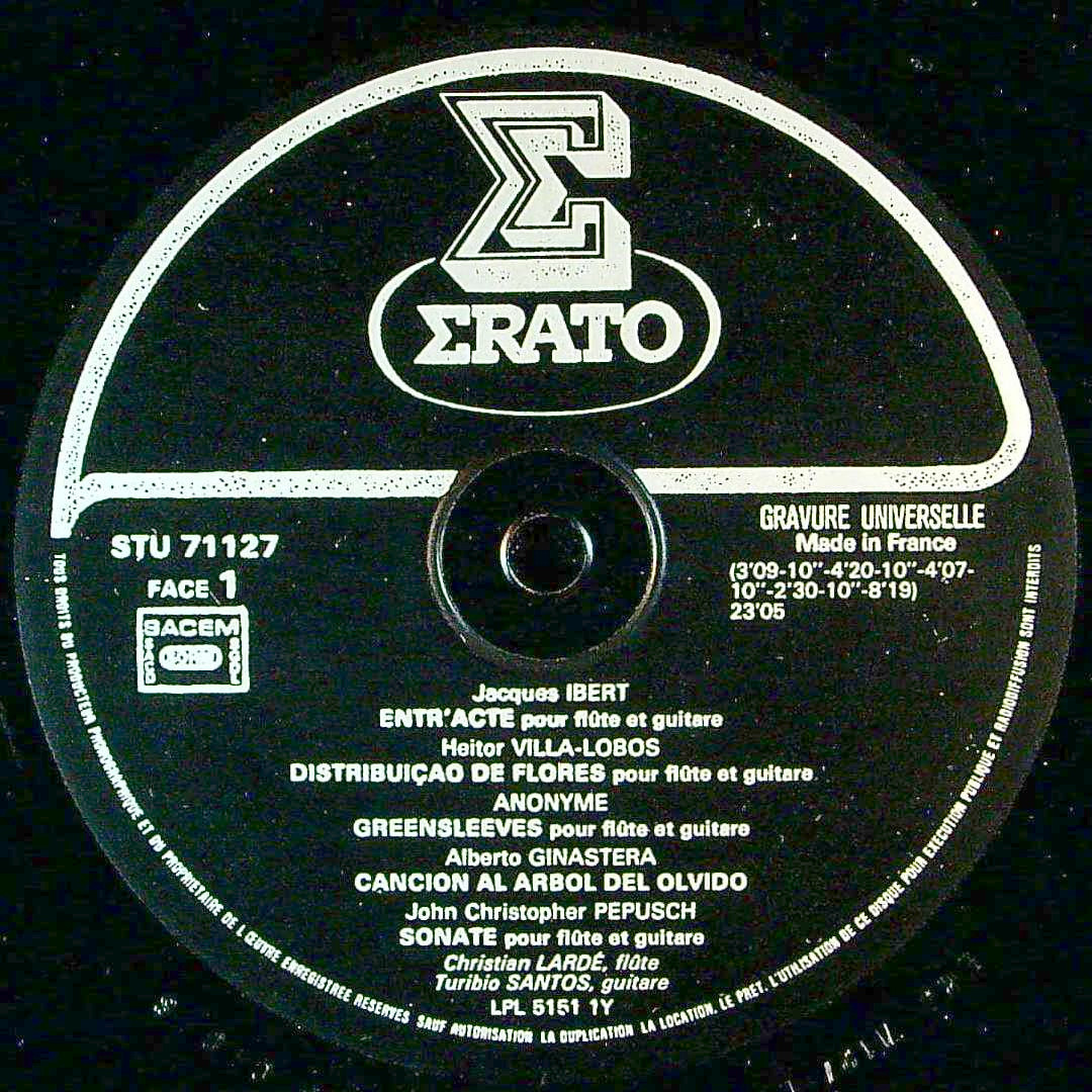商品コード:1392-062[ERATO] C.ラルデ(fl) T.サントス(gt) / FlとGtのための作品集/イベール:間奏曲, ヴィラ・ロボス:花を分ける, 作者不詳:グリーンスリーブス 他