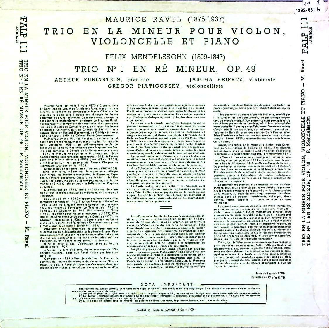 商品コード:1392-037b[VSM] ルービンシュタイン ハイフェッツ ピアティゴルスキー/ メンデルスゾーン:PfトリオOp.49, ラヴェル:Pfトリオ1番Op.49