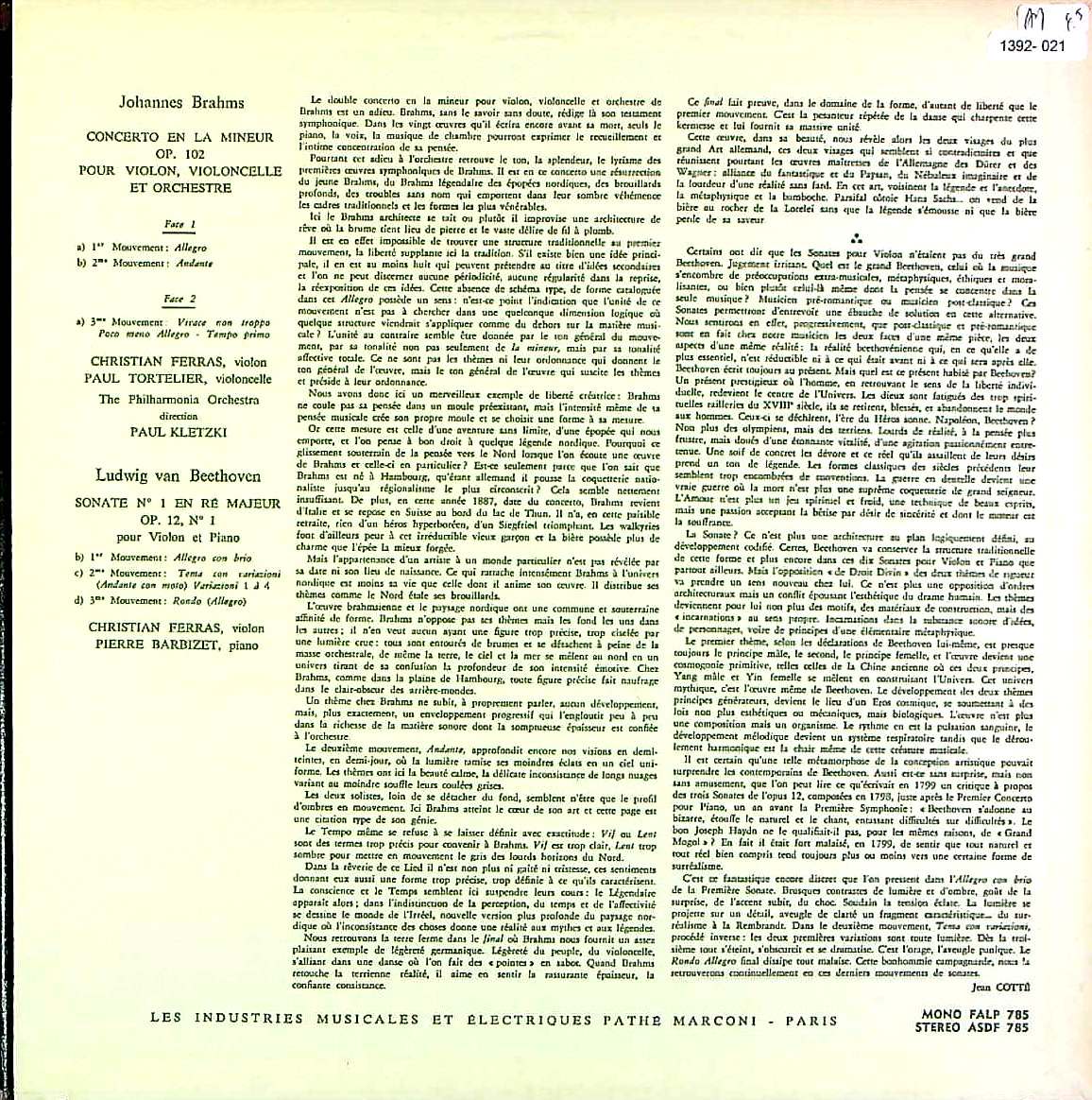 商品コード:1392-021[VSM] C.フェラス(vn) P.トルトゥリエ(vc)/ ブラームス:二重協奏曲Op.102, ベートーヴェン:Vnソナタ1番Op.12-1