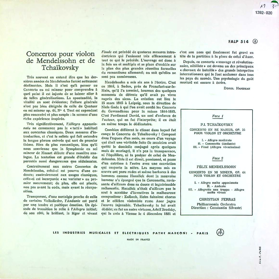 商品コード:1392-020[VSM] C.フェラス(vn)/ チャイコフスキー:Vn協奏曲Op.35, メンデルスゾーン:Vn協奏曲Op.64