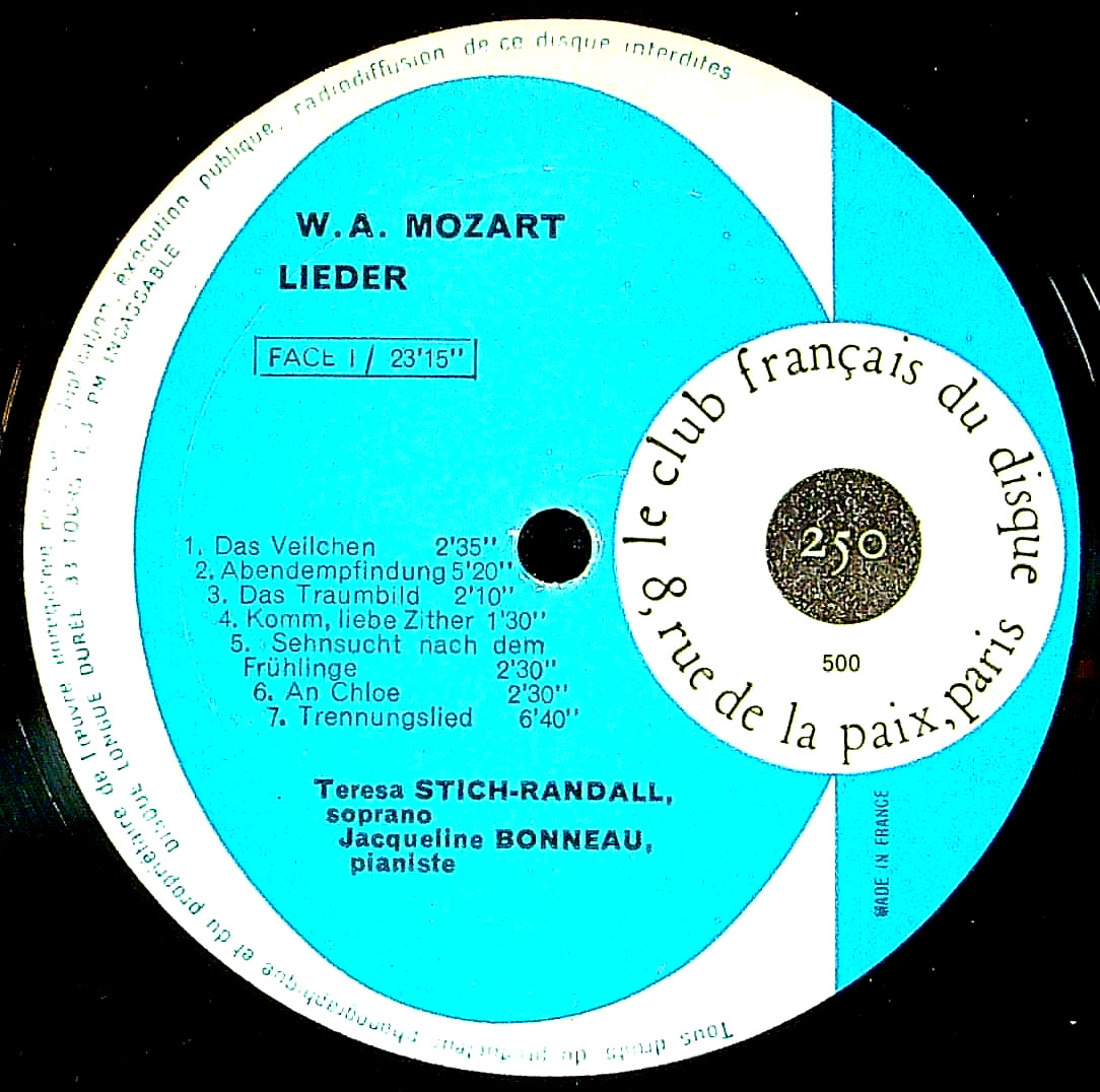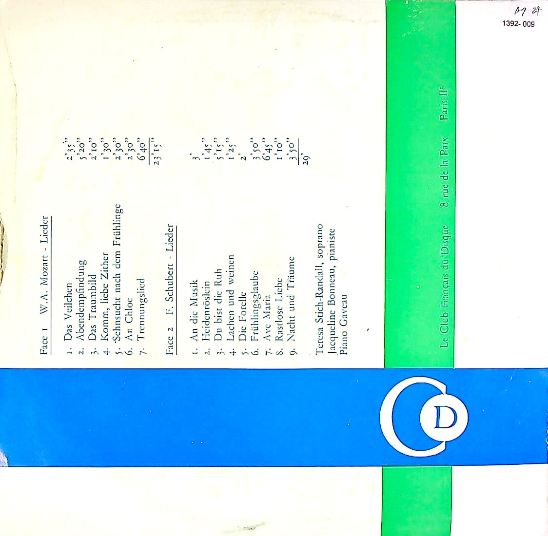 商品コード:1392-009[Club Français] T.シュティヒ・ランダル(s)/ 歌曲集/モーツァルト(7曲), シューベルト(9曲)