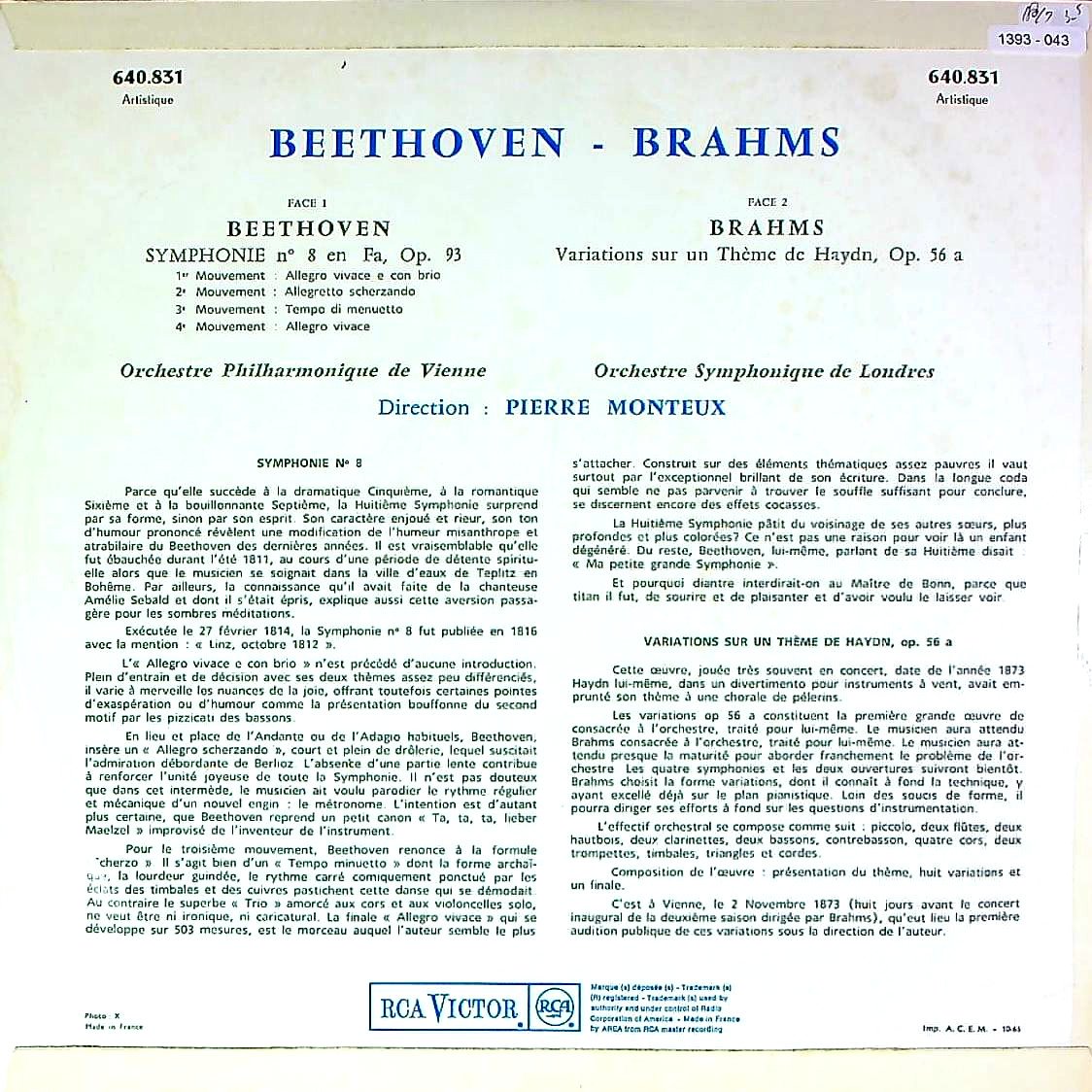 商品コード:1393-043[RCA] P.モントゥー/ ベートーヴェン:交響曲8番Op.93, ブラームス:ハイドン変奏曲Op.56a