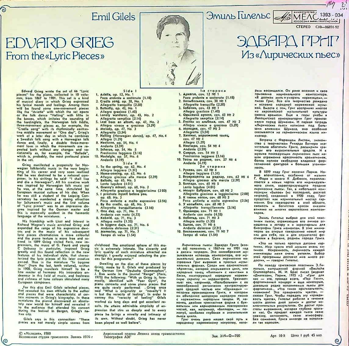 商品コード:1393-034t[MELODIYA] E.ギレリス(pf) / グリーグ:抒情小曲集(全10巻/66曲)~抜粋20曲