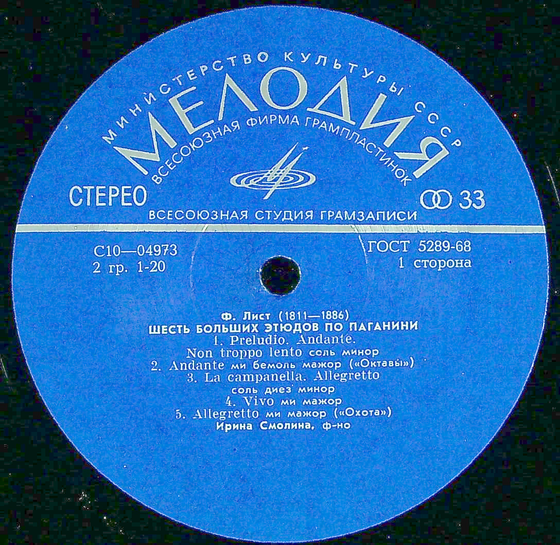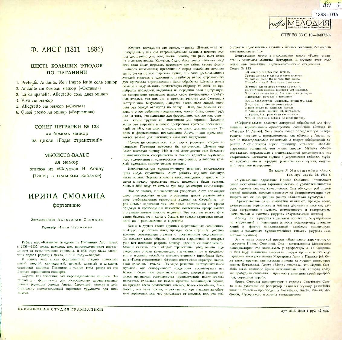 商品コード:1393-015n[MELODIYA] I.スモリナ(pf) / リスト:6つの超絶技巧練習曲, ペトラルカのソネット123番, メフィスト・ワルツ