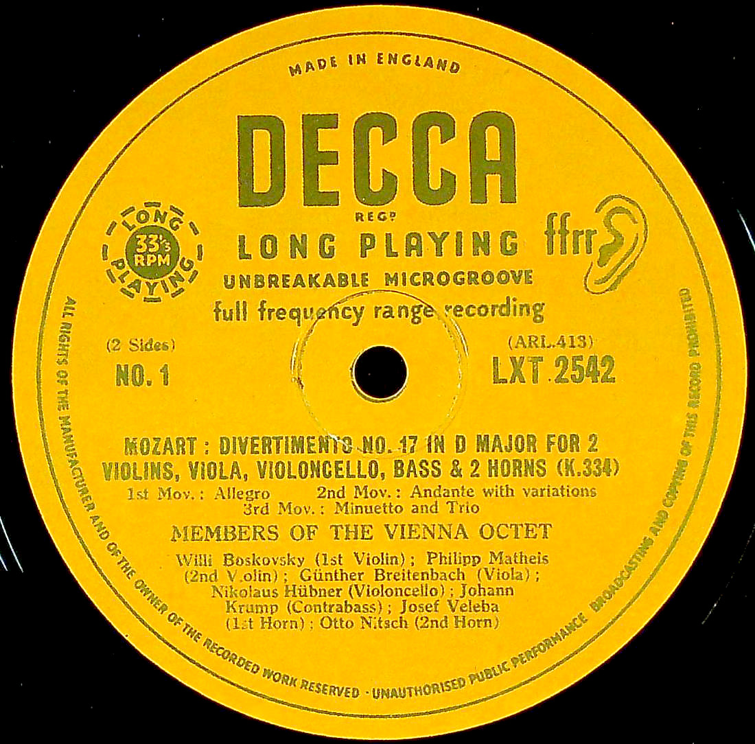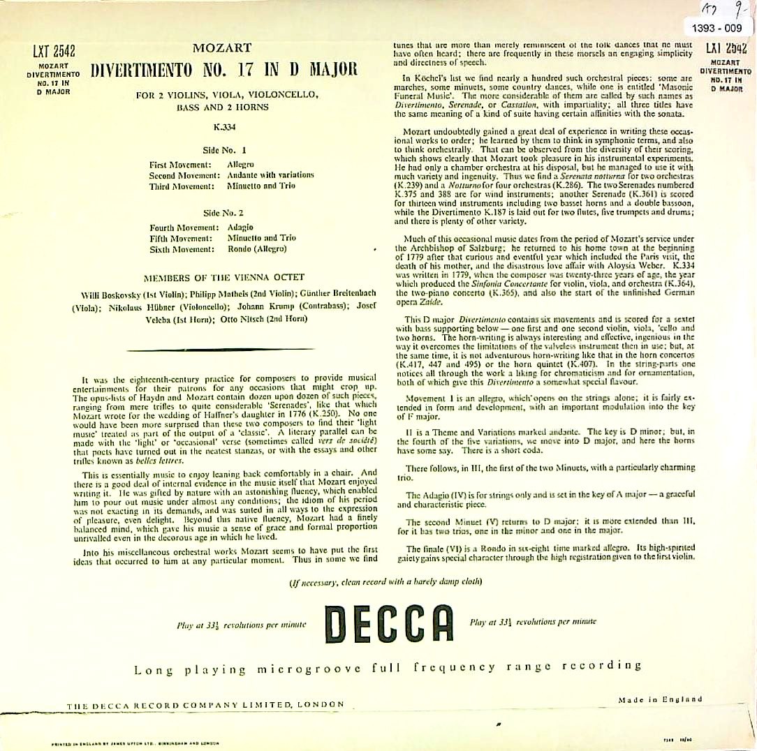 商品コード:1393-009[DECCA] ウィーン八重奏団のメンバー/ モーツァルト:ディヴェルティメント17番K.334