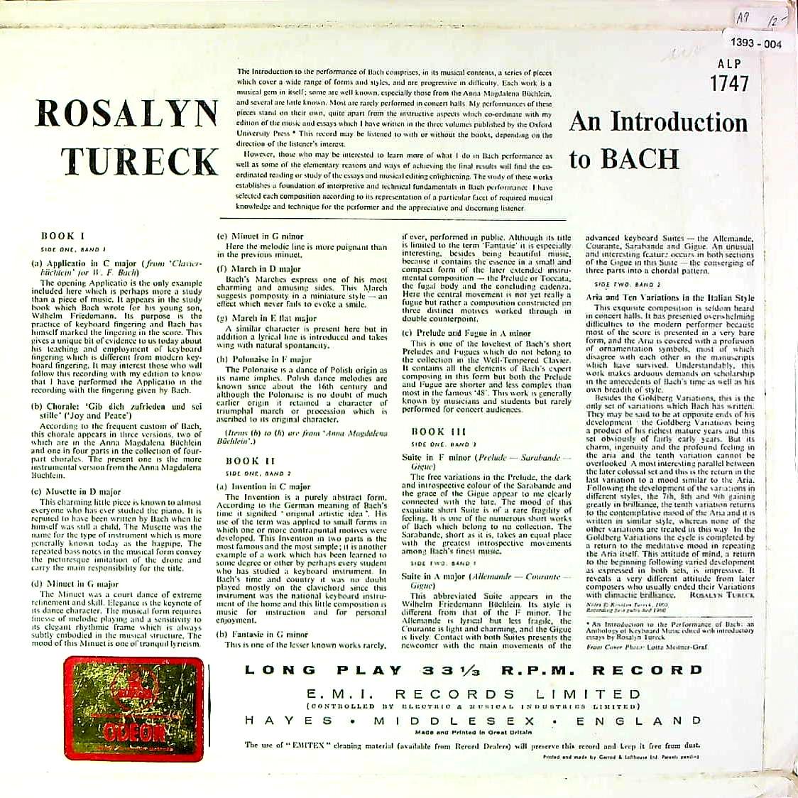 商品詳細:1980年代、日本では知る人もいなかったロザリン・テューレックだが今ではすっかり人気のバッハ弾きとなった。1914年アメリカ生まれ、父親はトルコ人、ジュリアード音楽院にてS.テレミンに師事。本人は認めないが、グレン・グールドは彼女の演奏を参考にして独自のスタイルを築いた。よく両方を聴き比べると分かる。奇才グールドはテューレックの落とし子なのである。モノラル期で録音を終えたかに見えたが、3冊のバッハ教則本の出版に伴って3種のLPを発売。中でもこの1枚が最後のアナログ録音。その後CD新録音が数枚ある。2003年没。バッハ弾きとしての真価が求められたのは亡くなってからであったが、凄まじい勢いでその名前は世界中に浸透し古いLPだけでなくデジタル録音まで入手が困難になってしまった。今回久々の入荷はテューレックが1960年HMVから発売した「An Introduction To Bach」。テューレックが著したバッハのピアノ教則本を少なくとも3冊上梓していて、この演奏はその手法に則ったものと思われる。テューレックは1981年CBSに同一タイトルの同様のLPを再録音してる。これが最初の「An Introduction To Bach」である。ロザリン・テューレック(1914 - 2003)は米国イリノイ州シカゴ出身。父親はトルコの血を引くユダヤ系ロシア人。4歳のとき、見よう見まねでピアノを弾き始め、その後アントン・ルビンシュタインの弟子のソフィア・ブリリアント=リーヴァン、およびレシェティツキの弟子のJan Chiapussoにピアノを学ぶ。9歳で公開演奏を行い、ジュリアード音楽院の入学前にはバッハの平均律全曲を楽譜なしで演奏できるまでになっていた。22歳のとき、カーネギーホールでオーマンディ指揮フィラデルフィア管弦楽団の演奏会に出演し、ブラームスのピアノ協奏曲第2番、皇帝協奏曲、ラフマニノフのピアノ協奏曲第2番等を演奏。デビューの1年後には、ニューヨークで6夜に及ぶバッハ・リサイタルを開催している。ロンドン公演では批評家から「…今日、世界で最も洞察力のあるバッハ解釈者の一人」との賛辞を浴びた。ピアノでのバッハ弾きとして世界的に認知されている。NHKでは2025年1月19日に「バッハのスペシャリスト ロザリン・テューレック」と題した番組が放送された。30年前は知る人ぞ知るピアニストだったが、今では世界が知るバッハ弾きとなった。
