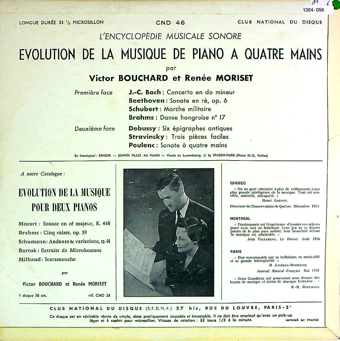 商品コード:1394-056[CLUB NATIONAL] V.ブシャール, R.モリゼ(pf) / ピアノ連弾の進化/J.C.バッハ, ベートーヴェン, シューベルト, ブラームス, ドビュッシー, ストラヴィンスキー, プーランク