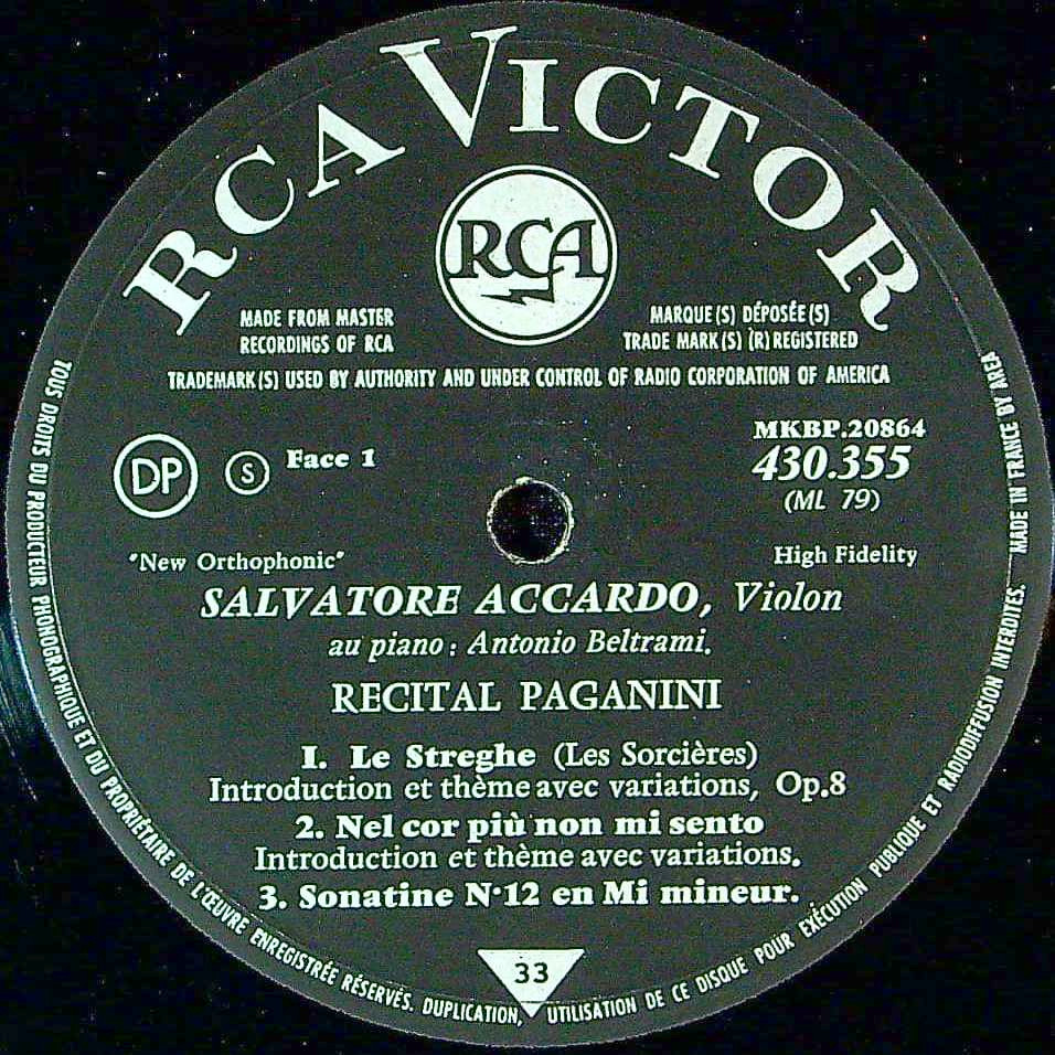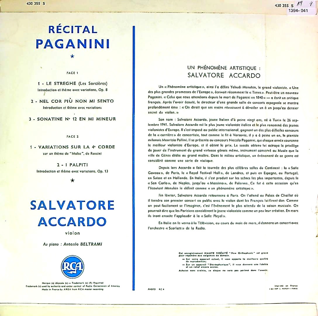 商品詳細:PRETORIAとフランスRCAの両方から出ている「パガニーニ・リサイタル」。アッカルドが、1958年のパガニーニ・コンクールで優勝した後の1959年3月に録音された、彼のデビュー盤である。また数ある彼のレコードの中でも、頂点に輝く演奏であることは勿論のこと、パガニーニのレコードの中でも数指に入る名演である。録音についても、当時のアッカルドの濃密で艶やかな弦の音がうまく録れており、ジャケットに写っている彼の表情と合わせると、ヴァイオリンの醍醐味を堪能できる1枚である。当初1959年にPRETORIA:30CL 8011にて発売され、1963年にフランスRCA:430 355で再版された。PRETORIA盤にはピアニストの名前がクレジットされていない。フランスRCAで再版された際にA.ベルトラーミ(pf)が記載された。実際聴けば確かにピアノ伴奏が申し訳程度に入っているものの、アッカルドのソロ演奏と言って差し支えない程にソロが全面に出た演奏で、アッカルドの超絶技巧を披露する為の録音と言って差し支えない。サルヴァトーレ・アッカルド(1941-)はイタリア生まれのヴァイオリニスト、ナポリのサン・ピエトロ音楽院でルイージ・ダンブロジオに、シエーナのキジアーナ音楽院でジョルジュ・エネスクの高弟だったイヴォンヌ・アストリュクに師事し、さらにナタン・ミルシテインにも師事する。13歳にしてトリエステで最初の演奏会を開いたという神童であった。その後、1955年にヴィオッティ国際音楽コンクールで3位入賞。さらに、1956年にジュネーヴ国際音楽コンクール、1957年イタリア放送の各コンクールで優秀な成績を上げ、さらに1958年のパガニーニ国際コンクールにおいて、17歳の若さで第1位を獲得する。「パガニーニの再来」という賛辞を贈られたほどであった。これがアッカルドのデビュー録音となった。その後1962年にイタリアRCAにパガニーニ「奇想曲全集」を録音し、一世を風靡した。PRETORIAでは当盤を含め3枚のLPを残した。今ではそのどれもが高額盤となっている。イタリアRCAでは1965年まで在籍し、1970年代にDGGへ移籍しパガニーニのVn協奏曲全集を録音、同時期にPHILIPSにも籍を置いた。多くの方はDGG以降の録音でしかご存じないのではないだろうか?アッカルドはDGGの前と後では別の奏者ではないかと疑う程、スタイルが異なる。特にPRETORIAの3枚は異常事態と言えるほどの、前のめりに攻めた演奏で息も付かせない激情的演奏を行う。大人しくなり、普通のヴァイオリニストになった後の録音しか知らない方にはショックを受ける内容である。初出はPRETORIAだがギガ・レア盤で高額!RCAは4年落ちの再販だが充分に良い音質!