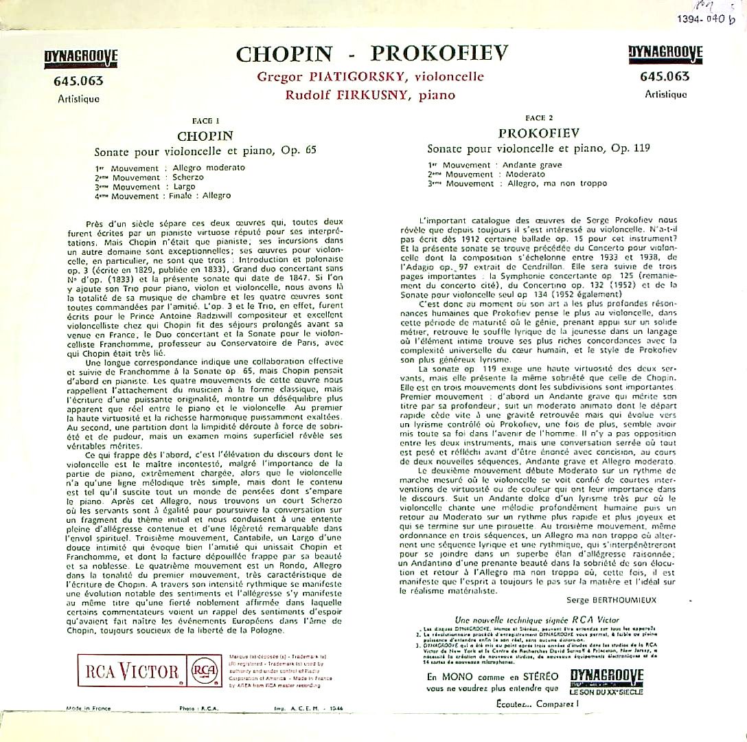 商品コード:1394-040b[RCA] G.ピアティゴルスキー(vc)/ ショパン:Vcソナタ Op.65, プロコフィエフ:Vcソナタ Op.119