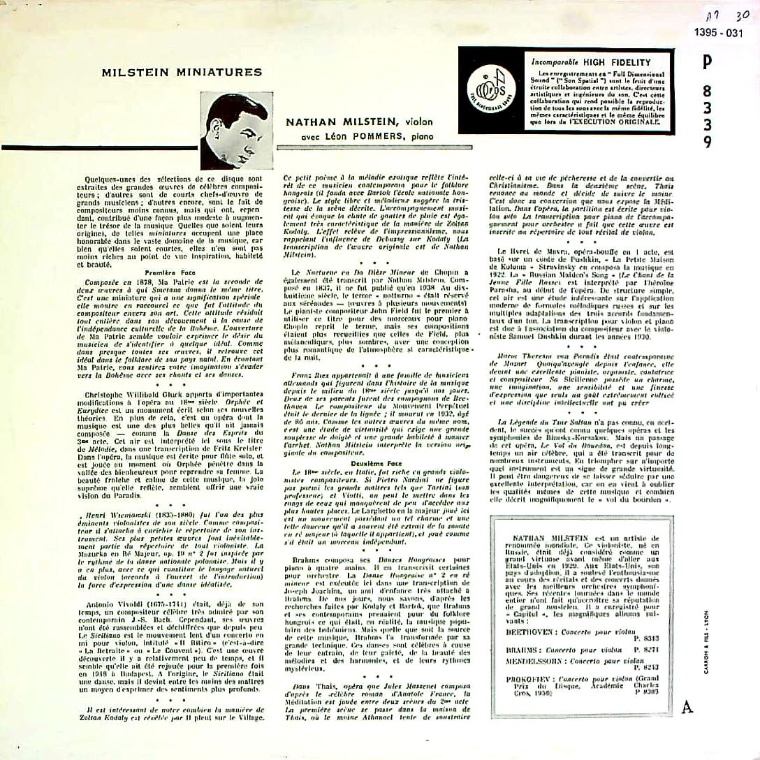 商品詳細:ミルシテインの数点ある小品集の中でも、この“Miniatures"はまとまりが良く、傑作の一つ。殆どの入荷が米盤だった。おそらく、この仏Patheプレスのフラット盤が史上最高の音質と信じる。CAPITOLは元々音圧が高く、音が強いので、力量感はまったく減っていない。しかも、そこにPatheの品の良さと、音の滑らかさ、そして音楽性というスパイスが加わり、これ以上は望めないという音で、ミルシテインのVnを楽しめる。やはりこの音でなければ!これがミルシテインの本来の音だろう。ナタン・ミルシテイン(1904 1992)はウクライナ・オデッサ(オデーサ)生まれのユダヤ系ヴァイオリニスト。英語読みではネイサン・ミルスタインとなるが当社ではナタン・ミルシテインで統一している。20世紀の傑出したヴァイオリニストの一人に数えられている。11歳のときレオポルト・アウアーの招きでペテルブルク音楽院に入学、アウアーのロシア時代の最後の弟子の一人となる。ロシア革命により1917年にアウアーがノルウェーに脱出してしまうと、キエフに戻り、ウラジミール・ホロヴィッツと知り合い、意気投合し、しばしば共演するようになり、1925年には西ヨーロッパでの演奏旅行も一緒に行った。この頃にはウジェーヌ・イザイの門も叩いている。1929年にレオポルド・ストコフスキー指揮のフィラデルフィア管弦楽団によりアメリカ・デビュー。ついにニューヨークに居を構えるが、度々ヨーロッパで演奏旅行に取り組んだ。1942年にアメリカ合衆国の市民権を取得。フランコ・ベルギー楽派の優美な演奏スタイルでその美しい音色から「ヴァイオリンの貴公子」と称される。CAPITOLはミルシテインを擁したことでクラシックファンからどれだけ信頼を得たか分からないレーベルである。正直少なくともクラシック音楽ではさほど大きな貢献のないこの米国レーベルが、業界で名声を持つのはひとえにナタン・ミルシテインの籍があったから、とするのは言い過ぎではないだろう。しかしどの指揮者やピアニストでも、ミルシテインの録音となればそれらは二の次であり、ミルシテインがソロを取ればピアニストや指揮者に対する言及は意味がないとさえ言える。これはいくつかあるピアノ伴奏付きの小品集で米国タイトルは「 Milstein Miniatures」。フランスジャケットでは米国デザインをそのまま使用、裏面のみフランス語に変更している。但しラミネート加工されたフランス製。スタジオ録音されたものだがフランス盤ならば音質には文句のないところ。日本で初期LPの始まりの時期に米国盤を購入された方はおられるだろう。お宝であるに違いないが米CAPITOLの最大の弱点はその強すぎる音質にある。2000年代に入りCAPITOL音源のフランスプレスが入手出来ようになると、昔大枚をはたいた米CAPITOL盤の価値が音をたてて崩れるさまを体験されたことだろう。日本盤→米国盤→フランス盤と順を追って音質が向上してゆく。これは真実なので仕方がない。英国盤も存在するがミルシテインの持つ弦の華やぎを再現するLPとしてフランスPathéプレス以上のLPはないと思う。品物の価値が時間ととも変化するのはLPに限ったことではない。最初からフランスPathéプレスを聴く方より、段階を踏んで来られた方のほうがその価値への認識は大きなものになるだろう。これは特別に録音が良いLP!状態の良いオリジナル盤は少ない!