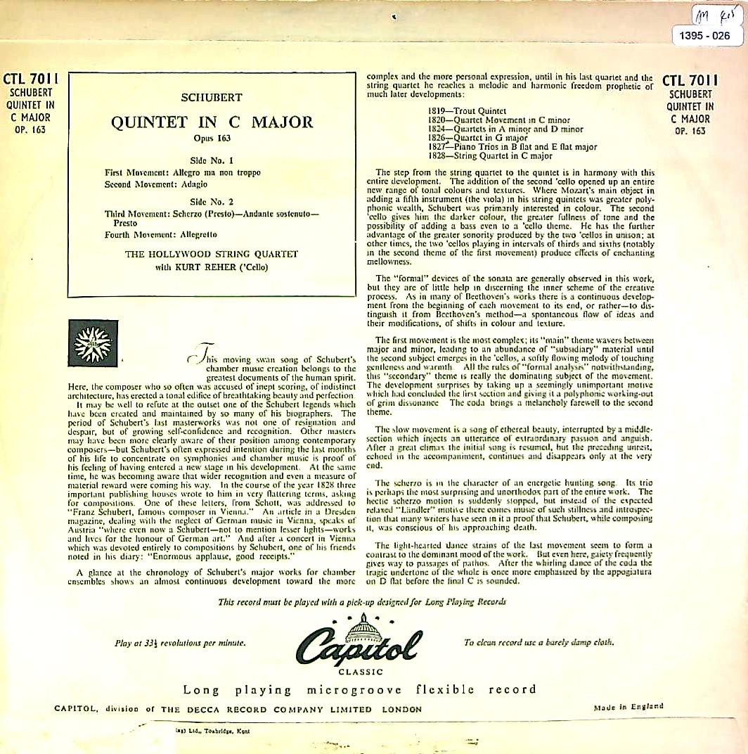 商品コード:1395-026[CAPITOL] ハリウッドQt. K.レハー(vc) / シューベルト:弦楽五重奏曲D.956