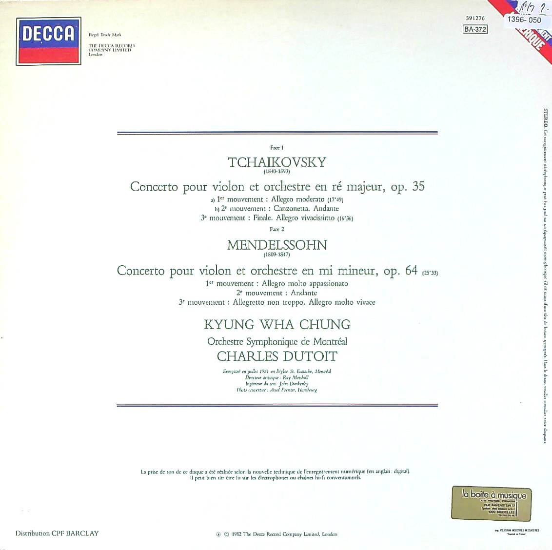 商品コード:1396-050[DECCA] C.キョンファ(vn)/ チャイコフスキー:Vn協奏曲Op.35, メンデルスゾーン:Vn協奏曲Op.64
