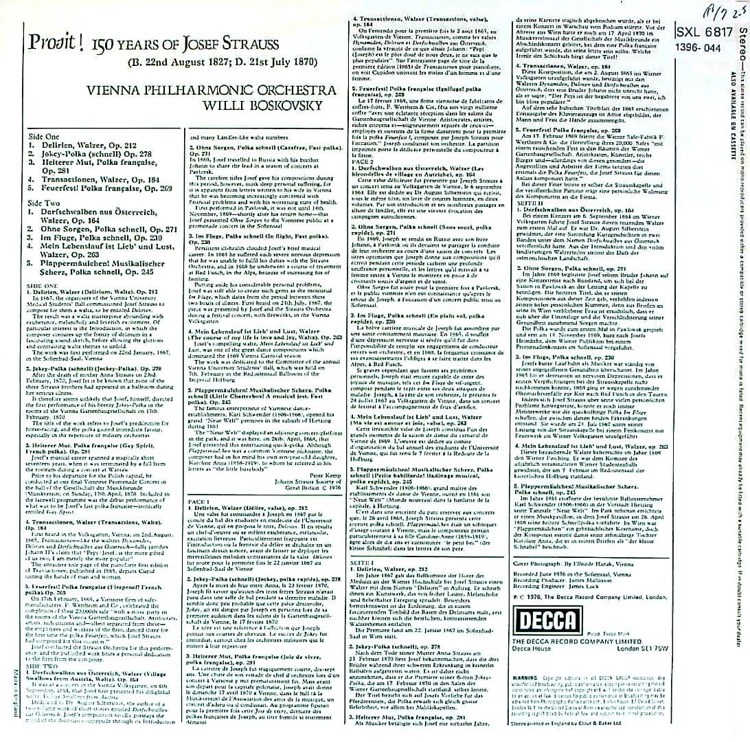 商品コード:1396-044[DECCA] W.ボスコフスキー/ J.シュトラウス生誕150年記念/うわごと, 騎手, 上機嫌, トランスアクツィオン, 鍛冶屋のポルカ 他