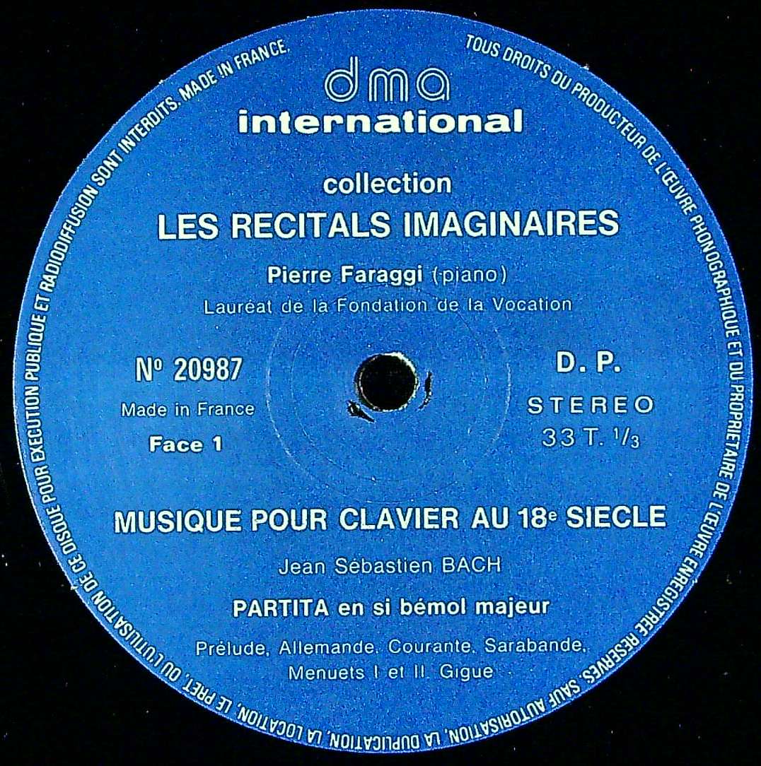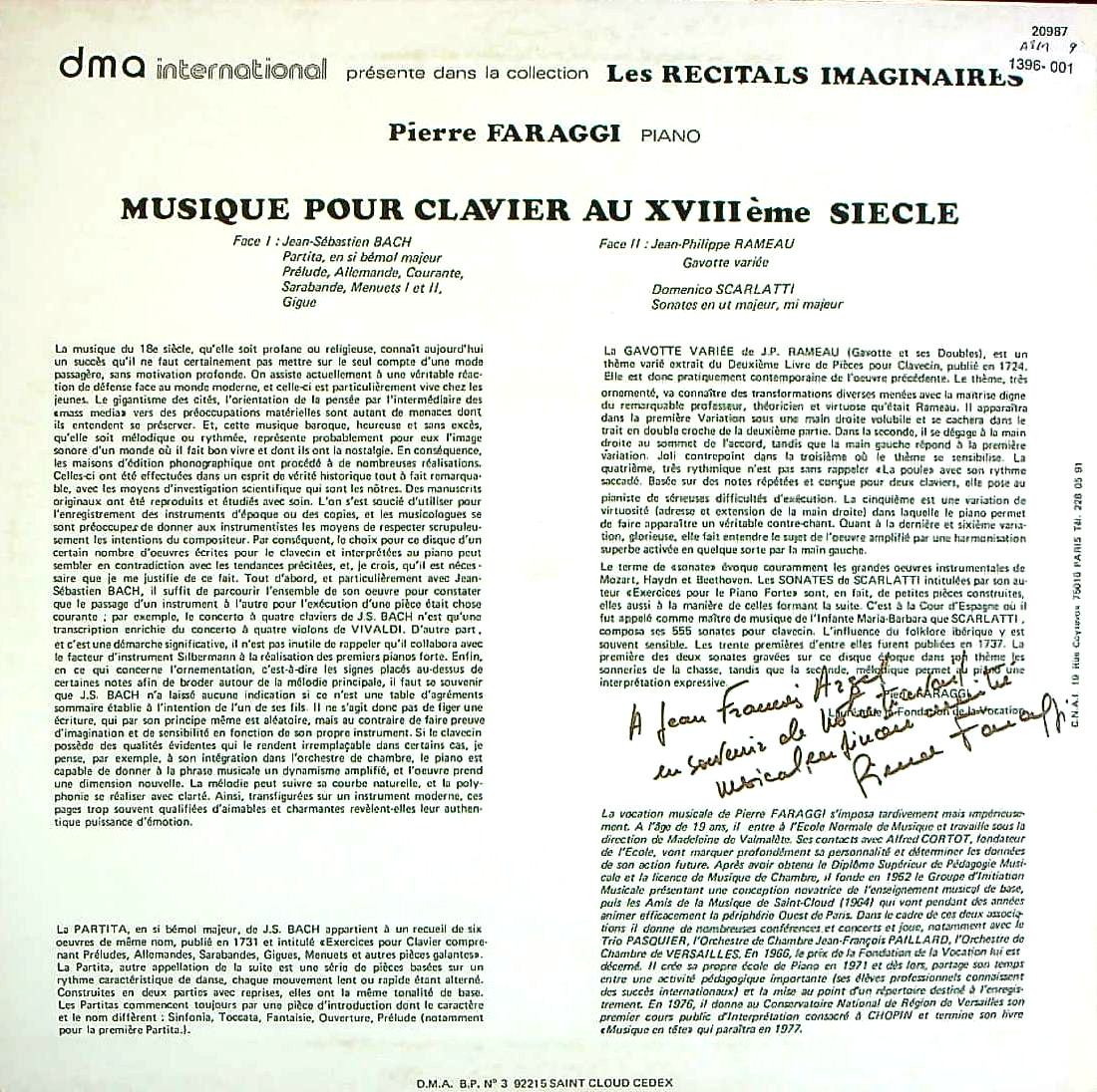 商品詳細:ピエール・ファラジ(不明)はフランス人ピアニスト。パリのエコールノルマル音楽院で学び、のちに同院でピアノの講師となっている。アルフレッド・コルトーに薫陶を受けた。30歳頃に自身のレーベル Prestige of French Interpreters を立ち上げ、録音制作にも関わっている。ピアノ教育にも力を入れ、1971年には 「ピエール・ファラジ・ピアノ学校(Pierre Faraggi Piano School)」 を創設。生徒は数千名に上り、音楽教育面で国際的な影響力も生まれている。録音は多くない。1976年に発売された Les Récitals ImaginairesシリーズはDma Internationalで確認できる唯一のLPと思われる。シリーズ名のLes Récitals Imaginairesは空想のリサイタルという意味で、これは実際のリサイタル・ライヴ録音ではなくパリのStudio Cnai-Fidsoundで1976年に録音されたもの。A面にバッハ:パルティータ1番、B面にはラモー:「ガヴォットと6つの変奏曲」とスカルラッティ:ソナタ2曲、L.104/L.23。特にスカルラッティの2曲は一度は耳にしたことがある有名曲である。ラモー:「ガヴォットと6つの変奏曲」は録音こそ少ないが、こちらもフレンチ・バロックの名曲の一つ。全3曲とも流し聴きでも、真剣でもどちらにも堪えうる名曲である。ピエール・ファラジの演奏は教育者らしい、奇を衒わないシンプルだが味わい深いもので、ピアノの一音一音が何とも言えない美しさを放つ。演奏会の名手というより、上手くて良い先生という印象。18世紀の鍵盤音楽とタイトルを付けた通り、時代を代表するドイツ/フランスの名作であり、飽きずに愉しめる名ピアノLPである。但しこのLPはほぼプライヴェートに近い超マイナー・レーベルであり、2度目は全く保証できない珍品中の珍品である。一期一会の激レア盤!