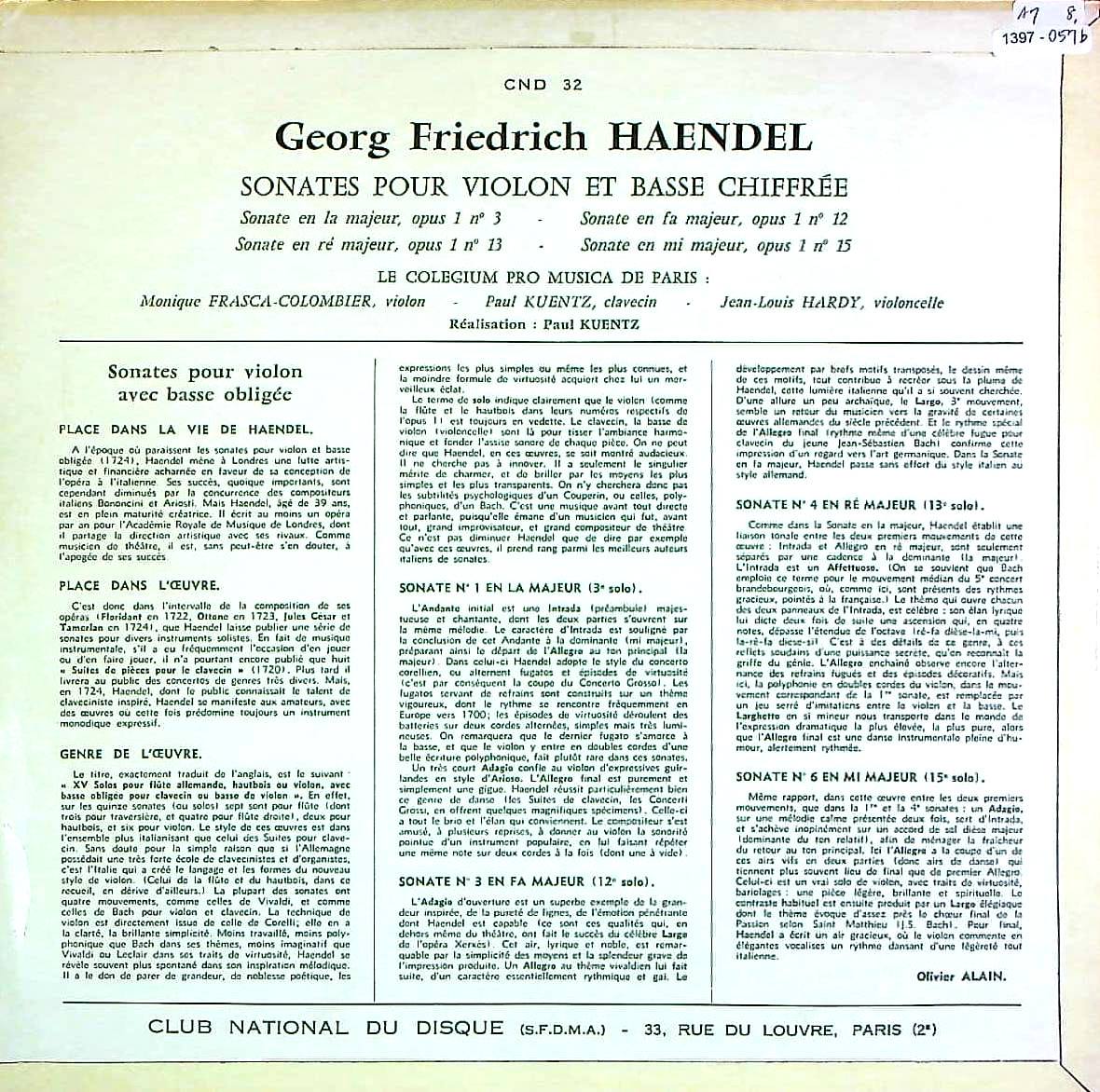 商品コード:1397-057b[CLUB NATIONAL] パリ・コレギウム・プロ・ムジカ・メンバー/ ヘンデル:Vnソナタ集Op.1(抜粋4曲)/3番, 13番, 12番, 15番