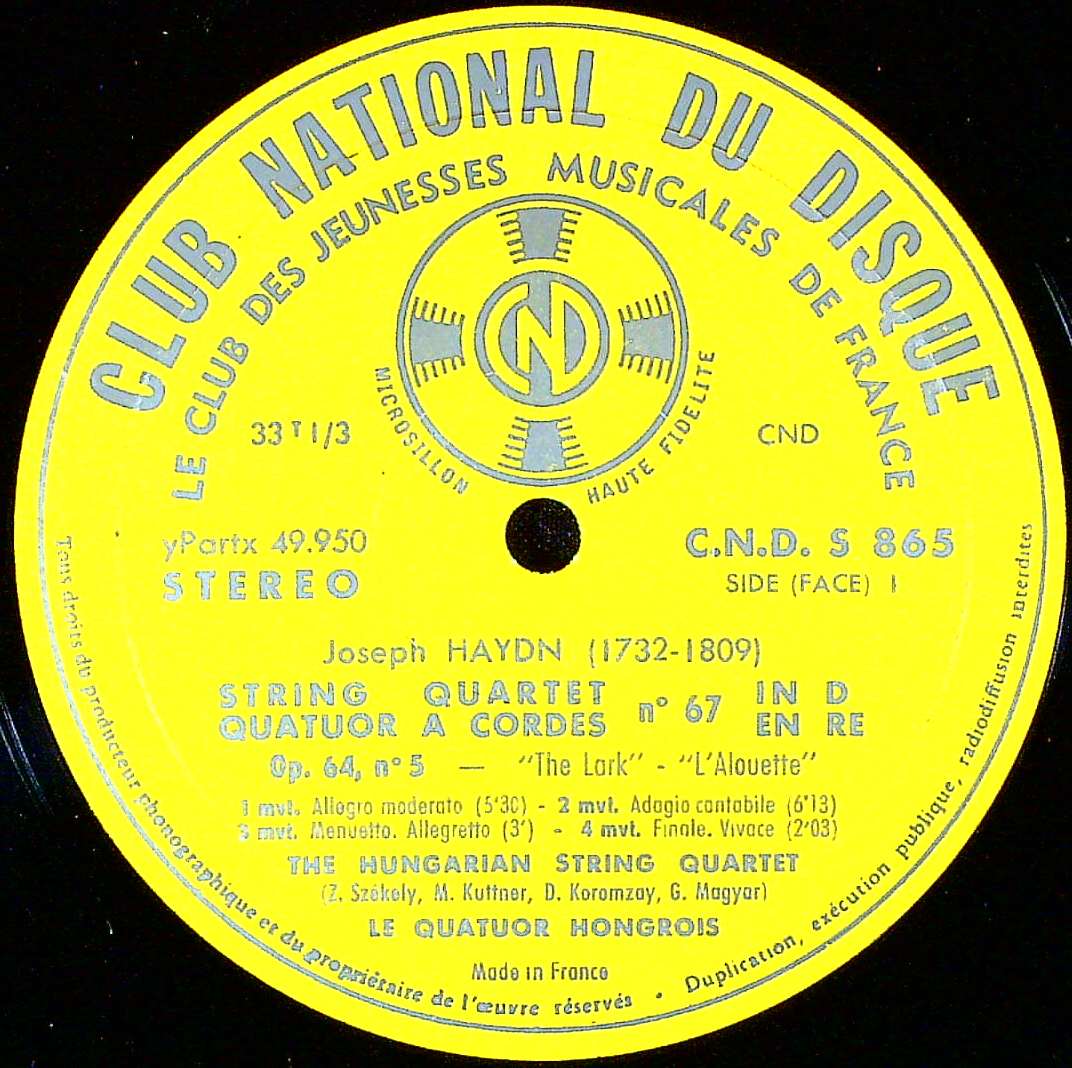 商品コード:1397-052[CLUB NATIONAL] ハンガリーQt./ ハイドン:弦楽四重奏曲67番Hob.III:63「ひばり」, 82番Hob.III:82「雲がゆくまで待とう」
