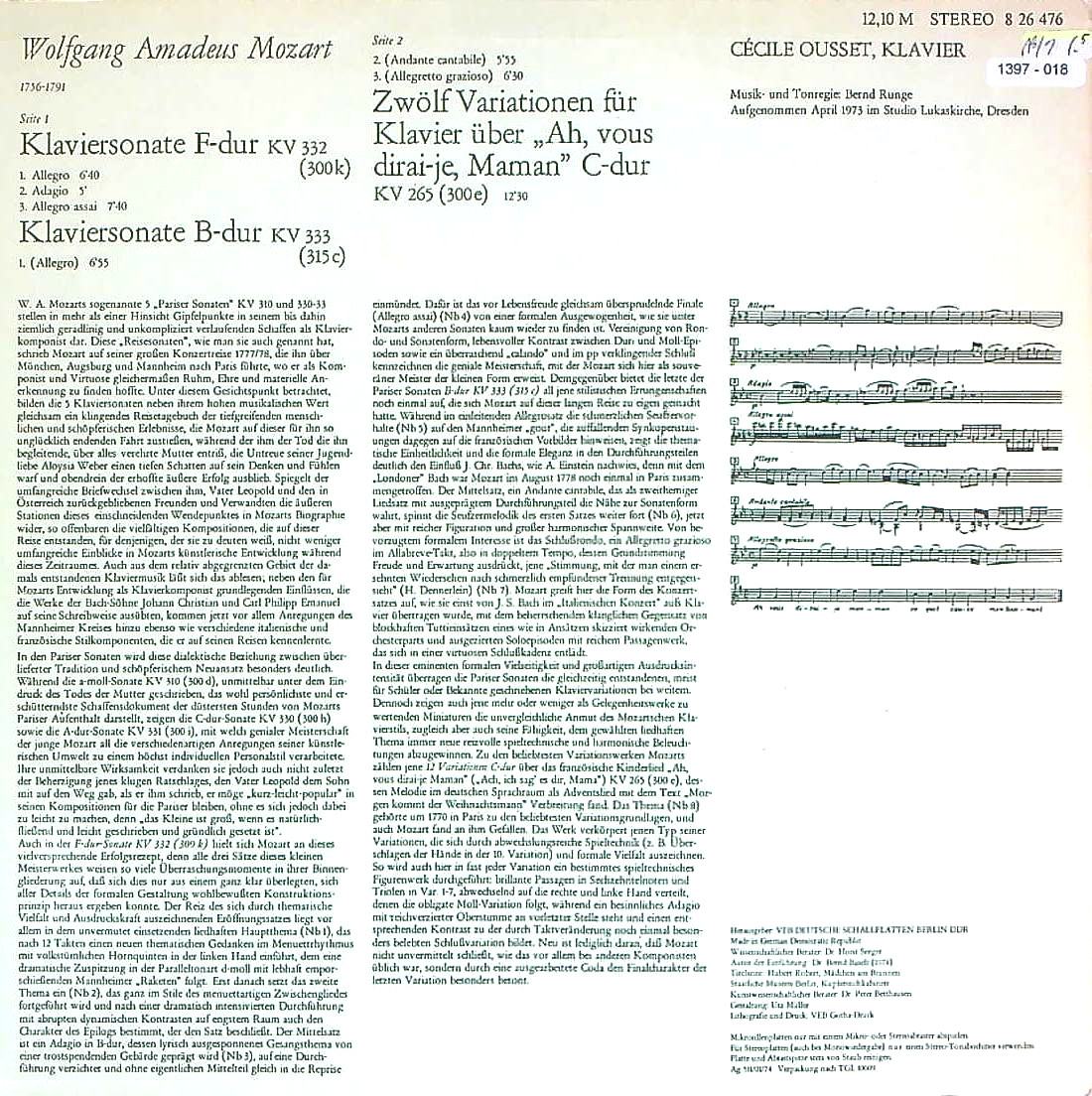 商品コード:1397-018n[ETERNA] C.ウーセ(pf) / モーツァルト:Pfソナタ12番K.332, Pfソナタ13番K.333, きらきら星変奏曲K.265