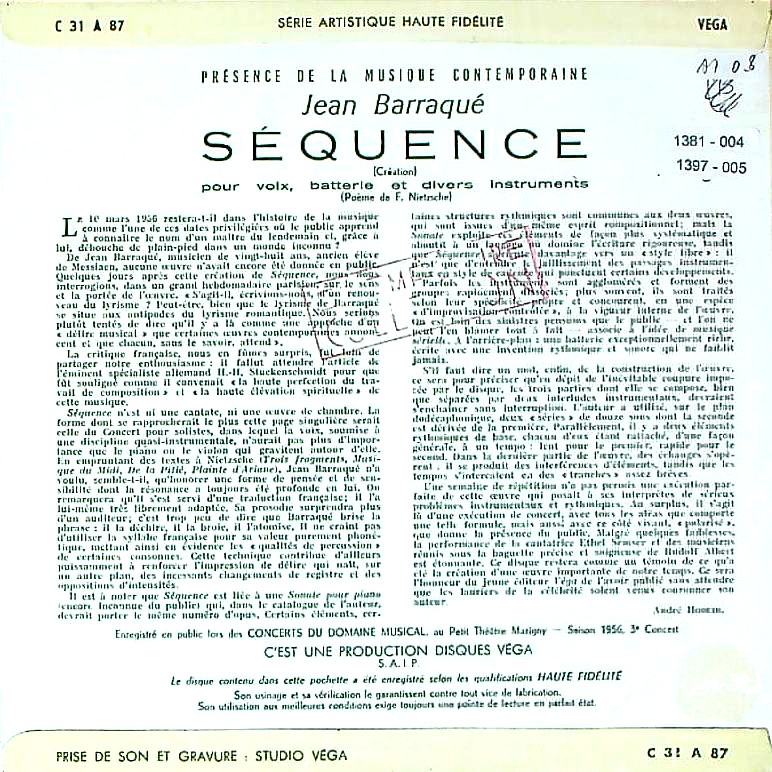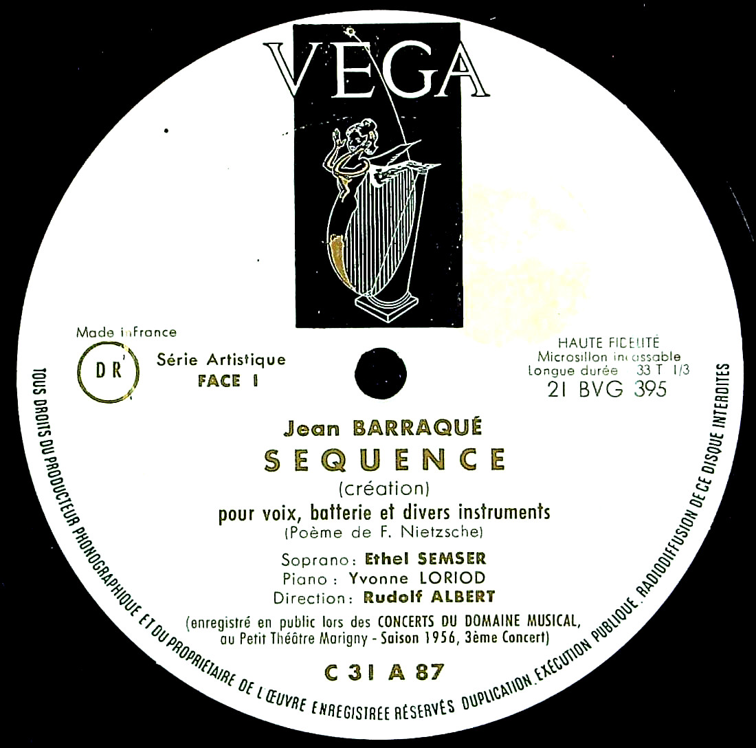 商品コード:1397-005[VÉGA] Y.ロリオ(pf) E.スムセ(s) R.アルベルト指揮管楽Esn. ジャン・バラケ:芸術監督 / J.バラケ:セカンス(1956)