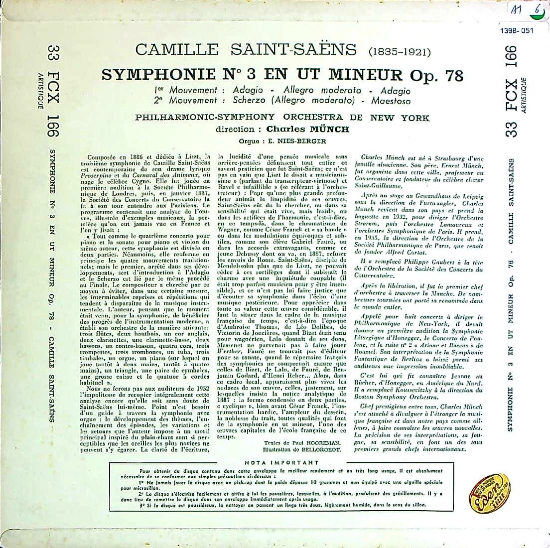 商品詳細:欧州でサン・サーンスの「交響曲第3番」といえばクリュイタンスだが、米国ではシャルル・ミュンシュが昔から有名である。演奏会ではボストンso.とは1946~47年シーズンに3公演、1949~50年7公演、1950~51年2公演、1953~54年6公演、1958~59年2公演、常任指揮者退任後の1962~63年シーズン4公演、1965~66年5公演と数多く取り上げている。本人が好んだこともあろうが、聴衆の人気も絶大だったようだ。ミュンシュの録音は1947年に米Columbiaにニューヨークpo.と、1959年に米RCAにボストンso.とスタジオ録音していた。1966年にもボストンso.とRCAに録音している。これは初回の1947年録音で米COLUMBIA: ML 4120で1949年の最初期LPとして発売された。英国では1953年英COLUMBIA:33CX 1116で初リリース、仏COLUMBIA:FCX 166でも発売されたことを考えるとミュンシュの交響曲第3番は欧州でも評価を得ていたことがわかる。古い録音の割に音質は良い。米国録音だけあり、クリュイタンスよりメリハリのはっきりした演奏でやや早めのテンポを使っている。この機関車が突進するかのような導入部が米国では受けたように思われる。クリュイタンスでは聴き覚えのないアクセントが度々出現して、交響曲第3番の当曲に対し派手な演出をしていることがよく分かる。エンターテイメント性では完全にミュンシュに軍配が上がるだろう。但し米国ではもっとデフォルメされた演奏は多くあり、この程度ならミュンシュがフランス人であることを考えても逸脱する程ではない。演出次第でクラシック音楽といえども大きく表情が変わる手本のような演奏といえる。オルガン・ソロはドイツ系の奏者エドゥアルド・ニース・ベルガー (1903-2002)。アルバート・シュバイツァーの弟子であり共同制作者でもある。ドイツ領ストラスブール生まれ。1922年に19歳でニューヨークに移住し、残りの人生をオルガニストとして度々ニューヨーク・フィルの共演者として活動した。交響曲3番Op.78「オルガン付」の最初期の名演として知られる録音のフランス盤!