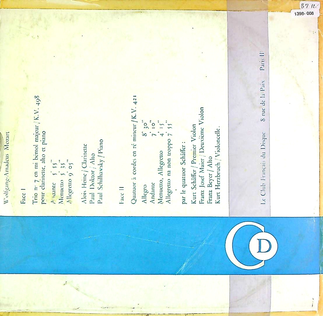 商品コード:1398-008[Club Français] A.ハイネ(cl) P.ドクトル(va) P.シルハフスキー(pf) 他/ モーツァルト:ClトリオK.498, 弦楽四重奏曲15番K.421