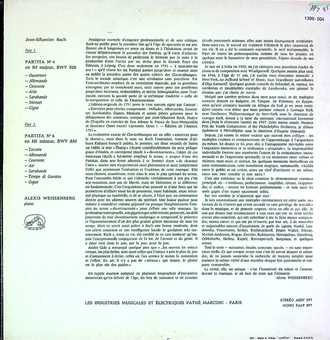 商品詳細:1966年2月~4月に録音されたパルティータ(2番を除く5曲)他のバッハ作品がバラ3枚で分売されて発売された。但し発売時期がレーベルの切り替え時期のまたがり、最初の1枚のパルティータ4/6番はモノラル/ステレオ(FALP 897/ASDF 897)で1967年頃発売された。Vol.2は1967年頃パルティータ1/3番他でここからステレオのみで単売された。同年連番でVol.3はパルティータ5/7番(フランス風序曲)他が発売され完結したかに見えたが、未録音だったパルティータ2番が1969年頃録音され、過去に単売LPの3枚のLPにパルティータ2番が加えられて圧縮した3枚組箱が発売された。パルティータ2番に単売LPは存在せず箱だけの発売になった。したがって初出の単売LPが3枚集まってもパルティータ2番は未収録である事をご承知いただきたい。LP時代には普通にある現象であり、そのあたりがCDとは根本的に異なるメディアである。どうしてもパルティータ全6曲を希望される方には3枚組箱 2 C 165-11123-5をお勧めする。但し箱はパルティータ2番以外は再版である。オリジナル性を重視する場合はパルティータ2番は諦めて戴くしかない。モノラルが存在する曲はVol.1の4/6番だけである。アレクシス・ワイセンベルク(1929- 2012)は、ブルガリア生まれのユダヤ人ピアニスト。苦労の末、米国に脱出した過去を持つ。その後、1946年にニューヨークのジュリアード音楽院に入学。サマロフ、ランドフスカ、そしてシュナーベルの指導を受け、卒業した時には、ワイセンベルクは各国から招かれるほど有名になっていた。1947年にレーヴェントリット国際コンクールで優勝、同年にジョージ・セル指揮のニューヨーク・フィルハーモニックと共演してデビュー。1956年、彼はパリに移り住み、数年間は主要な舞台から基本的に遠ざかり、技術とレパートリーの研鑽に励んだ。この時、彼はこう記している---「若い頃、私は新しい作品を非常に早く習得し、あまりにも早く演奏しすぎた。10年後には、私のレパートリー全体が過剰に演奏され、十分に研究されていない状態になっていただろう。50歳になってもまだ「将来有望なピアニスト」のままでいるのは嫌だったのだ。」---。1966年パリでのリサイタルで演奏活動に復帰し、1967年からはカラヤンと共演を重ねる。以降、コンサート、レコーディングを精力的に行い、一流ピアニストとしての地位を不動にした。復帰後はEMIと契約し、多くの録音を行った。バッハはワイセンベルクとしては珍しいレパートリーだが彼の持つ抒情性とパワーが上手くマッチして、優雅だけではない機能美が全面に出た演奏。メリハリのはっきりした演奏である。ある学者は「イタリア趣味」に傾斜し、「ドイツ組曲」というよりどちらかと言えば「イタリア組曲」と呼んだ方が妥当というほどに舞曲を含む組曲である。ワイセンベルクは曲の持つこの性質をよく理解した演奏に徹している。1曲ごとに性格が異なるそれぞれに的確なテンポとリズムを与え、有機的に温かみに満ちた演奏に終始している。中々の傑作といえる演奏ではないだろうか? 単売LPの印象は箱で聴いた取りとめもない印象とは大きく異なる丁寧で熟考されたものである。これはVol.1のモノラル盤!