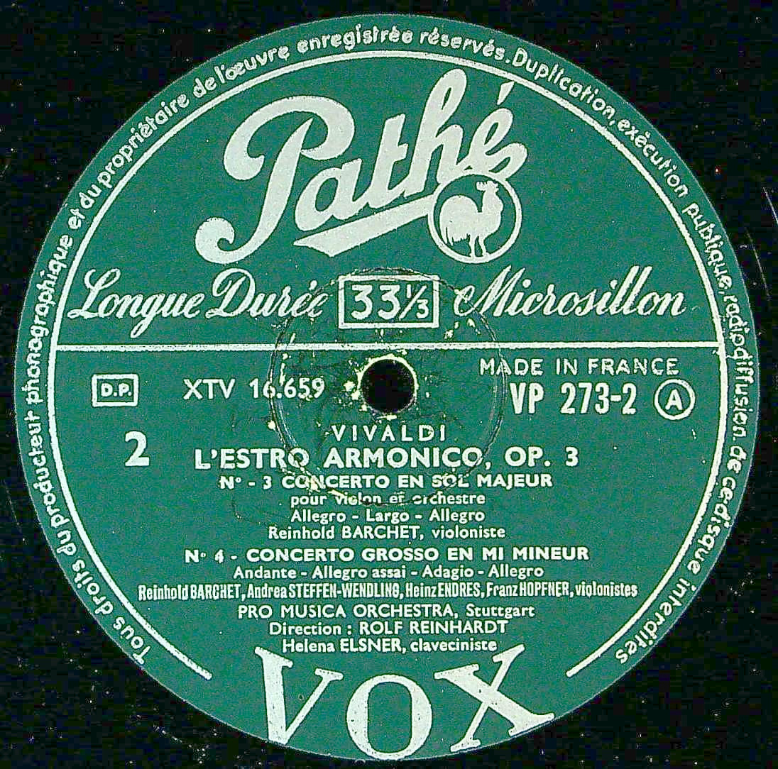商品コード:REG-4592[仏Pathé-VOX] R.バルヒェット(vn) R.ラインハルト/ ヴィヴァルディ:合奏協奏曲集「調和の霊感」Op.3~3, 4, 9, 10曲