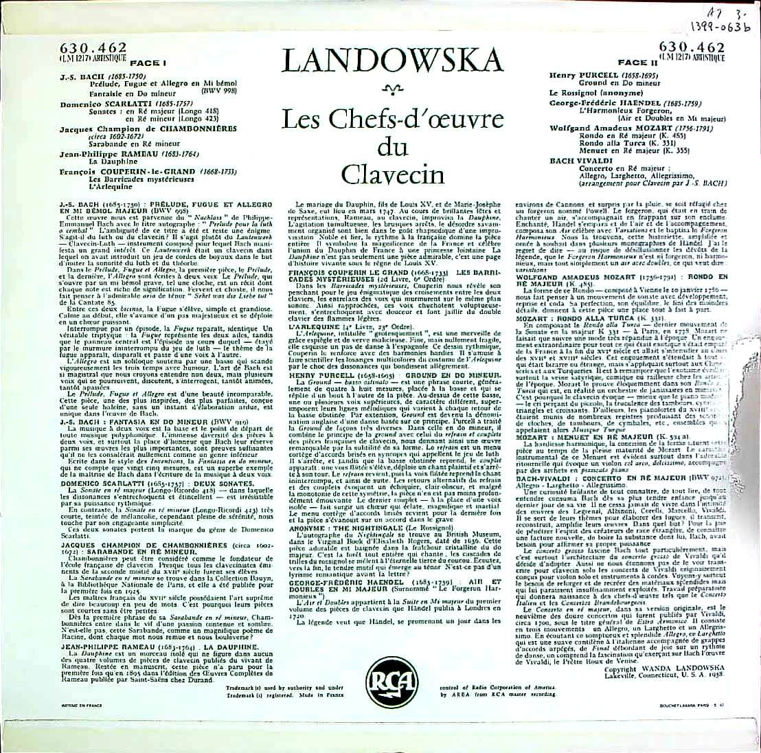 商品コード:1399-063b[RCA] W.ランドフスカ(cemb) / Cembリサイタル(全13曲)/バッハ, スカルラッティ, ラモー 他