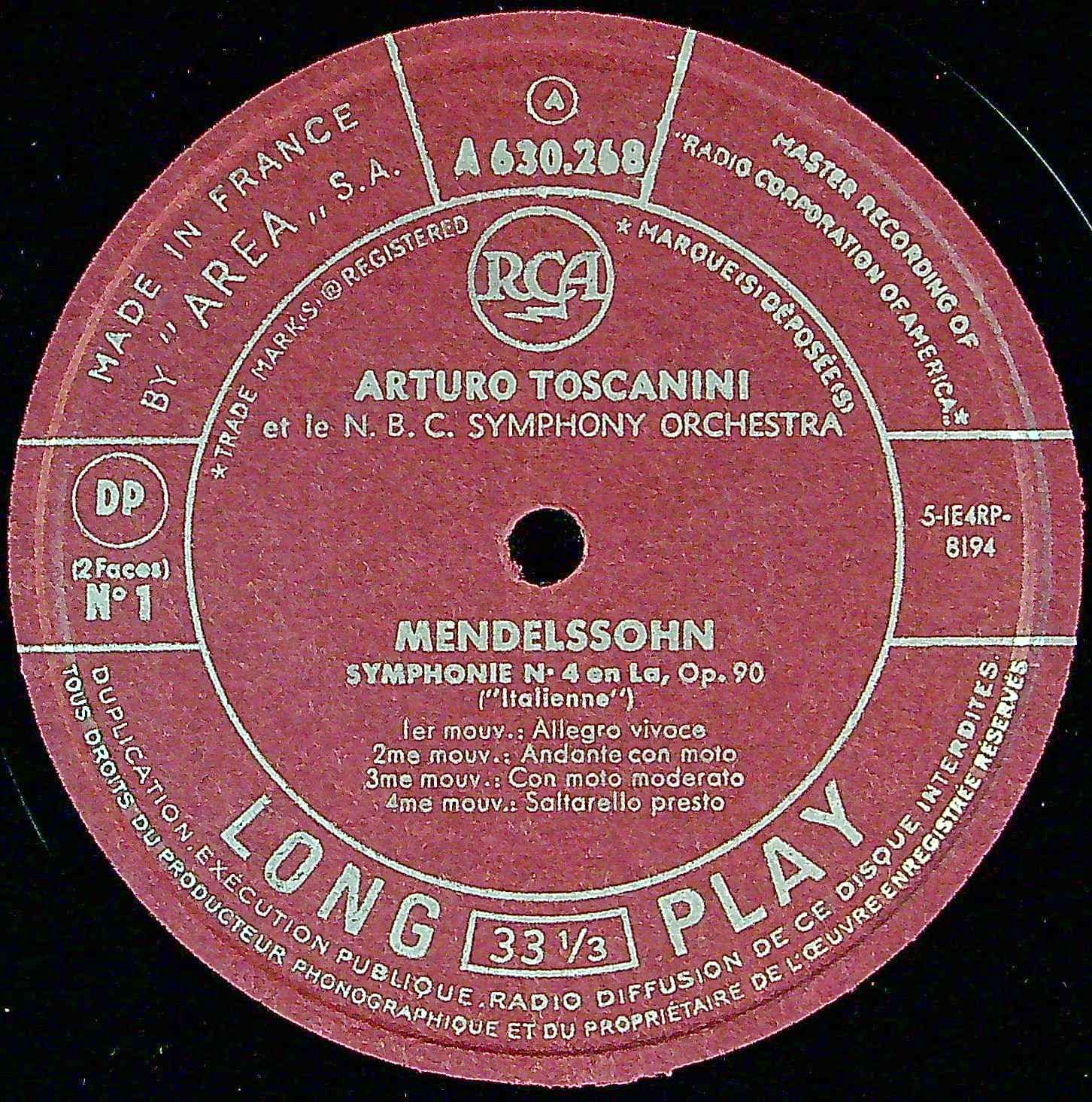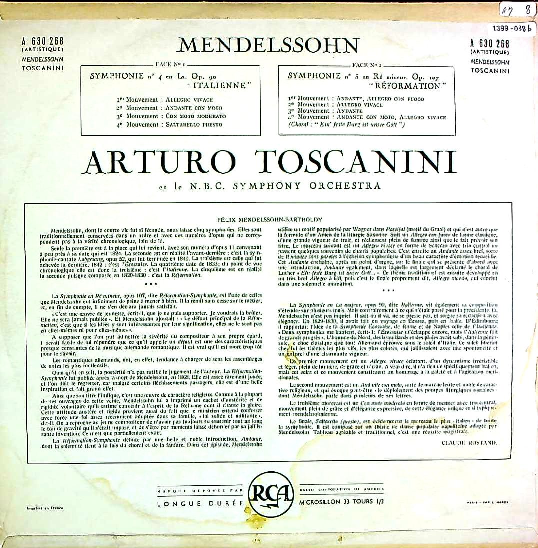 商品コード:1399-038b[RCA] A.トスカニーニ/ メンデルスゾーン:交響曲4番Op.90「イタリア」, 5番Op.107「宗教改革」