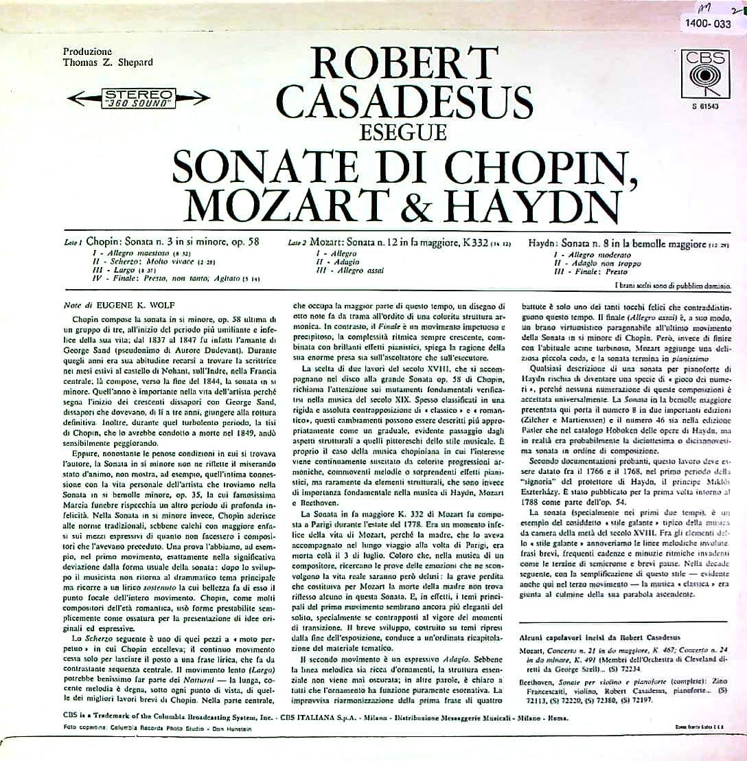 商品コード:1400-033[CBS] R.カサドシュ(pf) / ショパン:Pfソナタ3番Op.58, モーツァルト:Pfソナタ12番K.332, ハイドン:Pfソナタ31番Hob.XVI:46