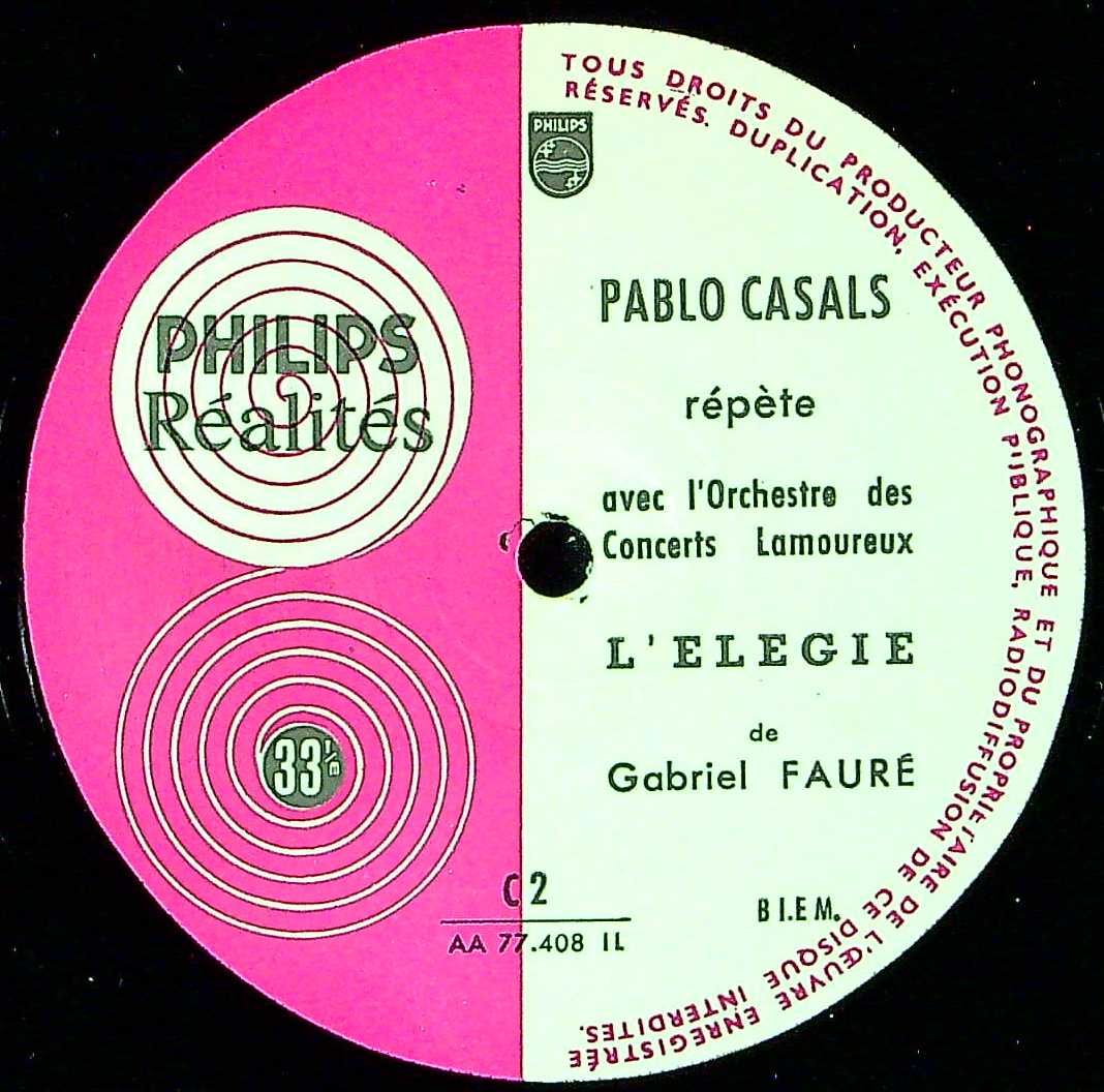 商品詳細:Hommage A Pablo Casals・カザルスに捧げると題されたシリーズ。RealitesシリーズのC 2が初出である。1956年パリ・ソルボンヌ大学でのライブ・コンサートと、そのリハーサル風景(A面)。フォーレのエレジー(通常はVcとPfの二重奏)を管弦楽伴奏版で演奏。B面はその本番のコンサートとカザルス自作の2曲・Les Rois MagesとSerdane、そして最後にバッハの無伴奏Vc組曲5番からサラバンドをソロで演奏。B面には4曲が入る。この時期、カザルスはスペイン軍事政府に抵抗して、演奏活動を停止していた。その中で本人が演奏したバッハこそが、このLPの聴きものである。身震いをする程の霊的な演奏だ。尚、のちにL 77408 Lでも再版された。エレジーの管弦楽伴奏版は1890年に指揮者エドゥアール・コロンヌの要請によってオーケストレーションを施された版でチェロと管弦楽伴奏で演奏される。編曲はフォーレ自身によって行われ、1901年に出版された。初演は同年、チェリストのパブロ・カザルスとフォーレ自身の指揮による。カザルスはこの管弦楽伴奏版の初演者であり、慣れ親しんだ曲を再演したことになる。リハーサルではコンセール・ラムルー管弦楽団 の他102人のチェロ・アンサンブル が参加している。カザルスはチェロと指揮の両方を担当。しかし本演奏では独奏チェロとコンセール・ラムルー管弦楽団 による演奏でカザルスはやはりチェロと指揮の両方を担当している。カザルスの作品である「サルダーナ」(Sardana)はカザルスを含む11人のチェロ奏者と102人のチェロ・アンサンブル で行われ、カザルスは指揮も担当。「東方三博士」(Les rois mages)は「サルダーナ」と全く同じ構成で演奏される、舞踊を基にしたチェロ・アンサンブル曲である。なんといってもこのLPのハイライトは最後の5分程度のバッハ:無伴奏Vc組曲5番よりサラバンドにある。カザルスの唸り声とともに紡ぎ出される音は正に神懸かっている!