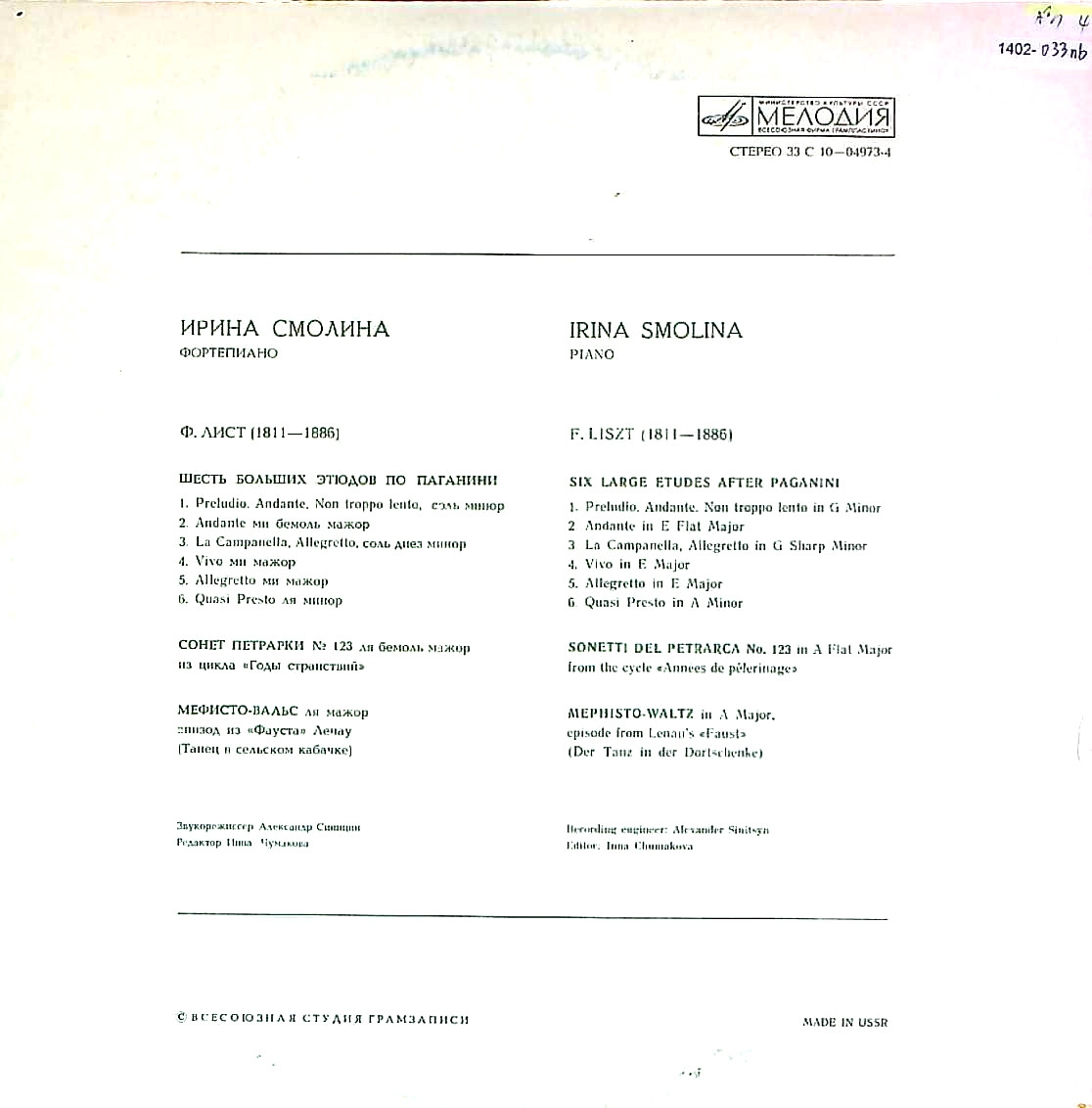商品コード:1402-033nb[MELODIYA] I.スモリナ(pf) / リスト:6つの超絶技巧練習曲, ペトラルカのソネット123番, メフィスト・ワルツ