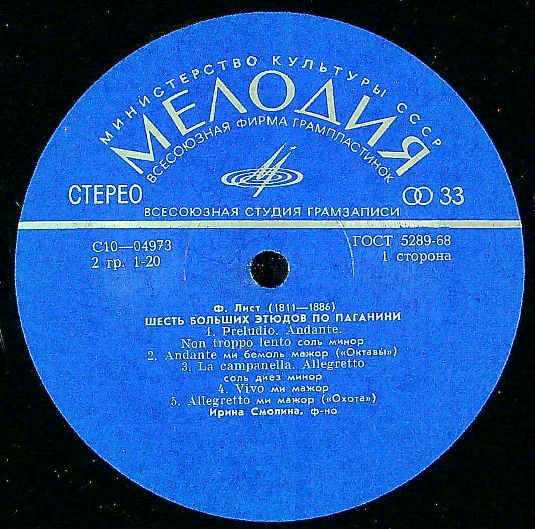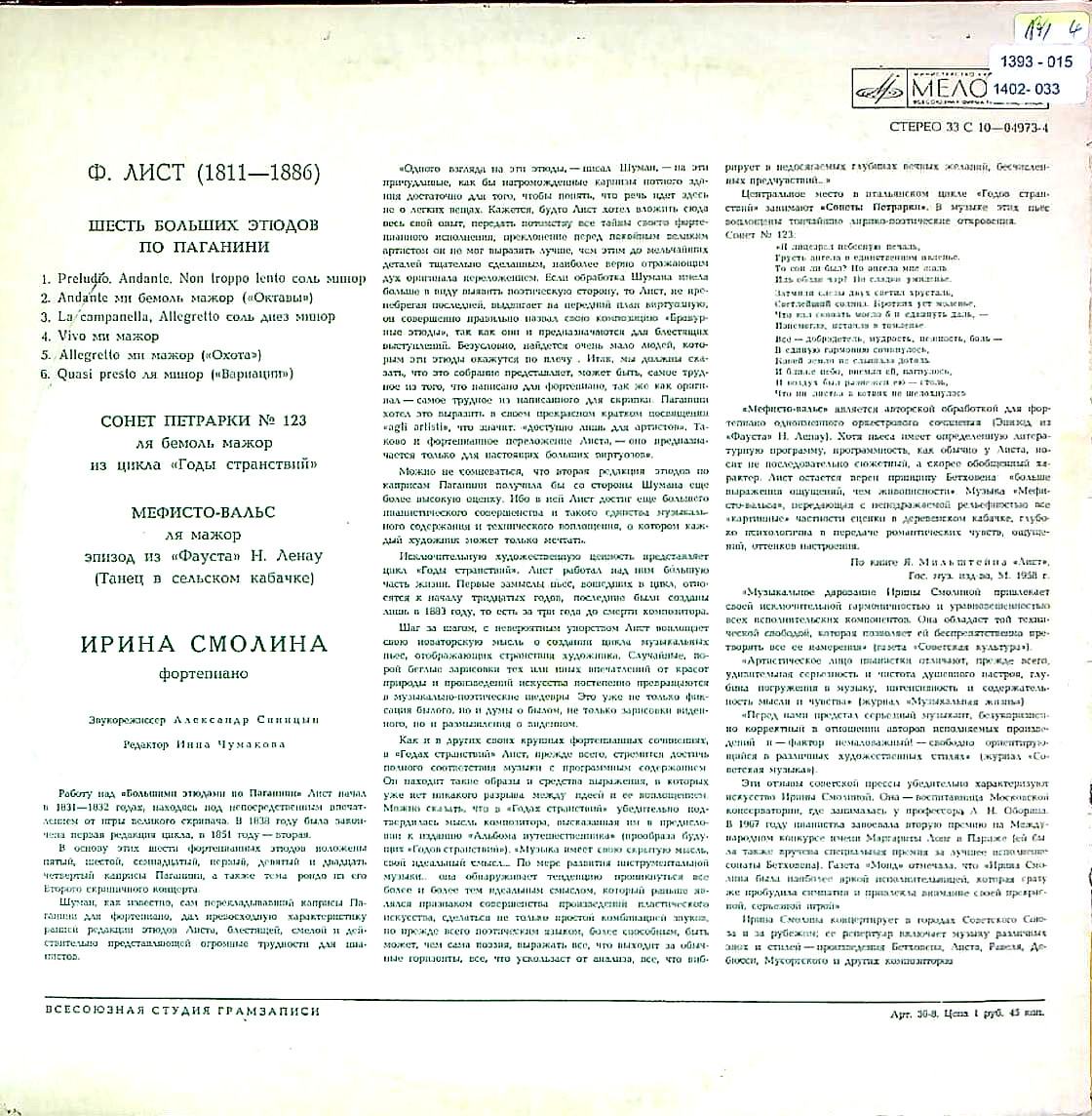 商品コード:1402-033n[MELODIYA] I.スモリナ(pf) / リスト:6つの超絶技巧練習曲, ペトラルカのソネット123番, メフィスト・ワルツ