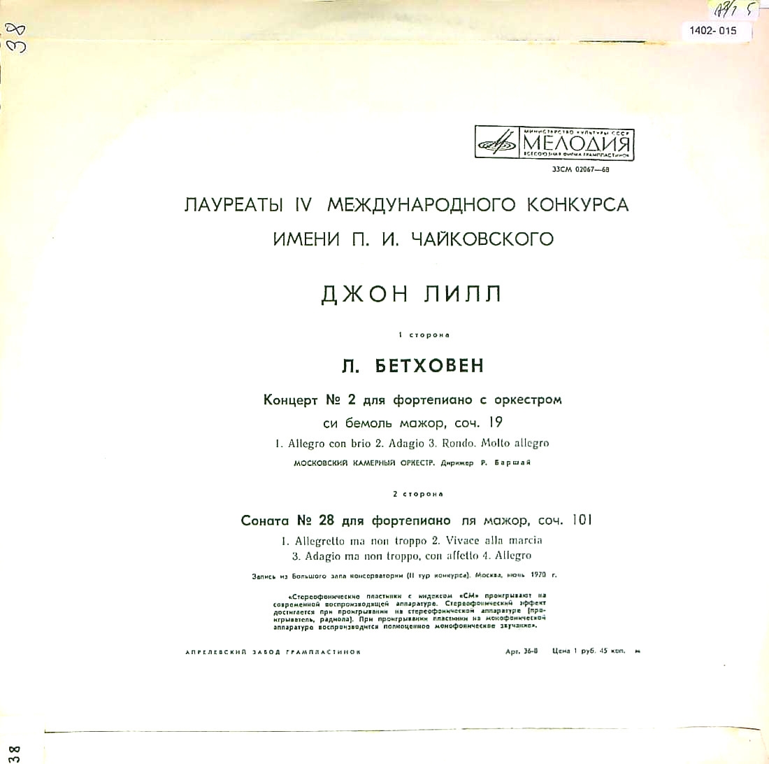 商品コード:1402-015n[MELODIYA] J.リル(pf) / 1970年チャイコフスキー・コンクール/ベートーヴェン:Pf協奏曲2番Op.18, Pfソナタ28番Op.101