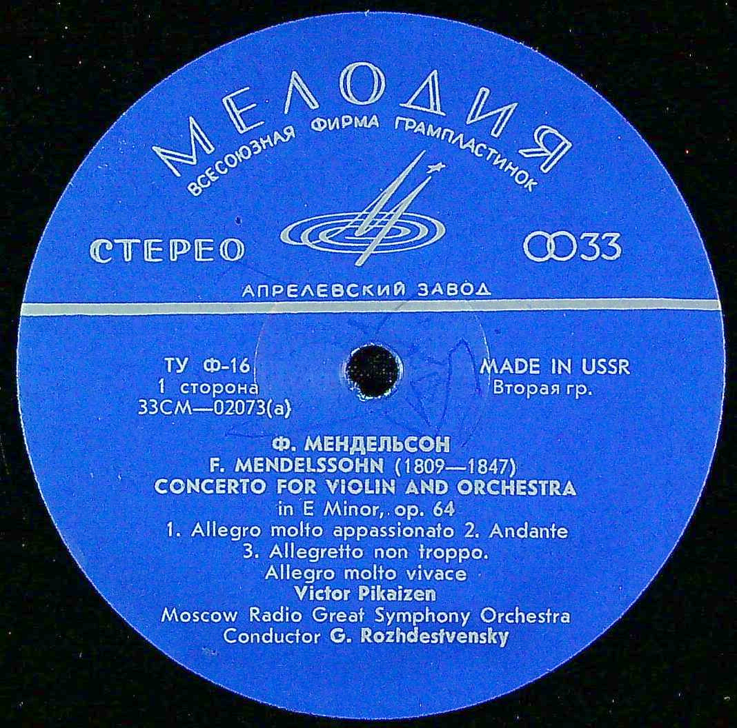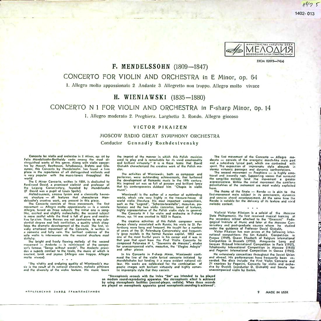 商品コード:1402-013n[MELODIYA] V.ピカイゼン(vn)/ メンデルスゾーン:Vn協奏曲Op.64, ヴィエニャフスキ:Vn協奏曲1番Op.14