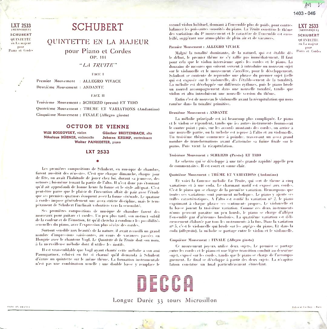 商品コード:1403-046p[DECCA] W.パンホーファー(pf) ウィーン八重奏団メンバー/ シューベルト:Pf五重奏曲D.667「鱒」