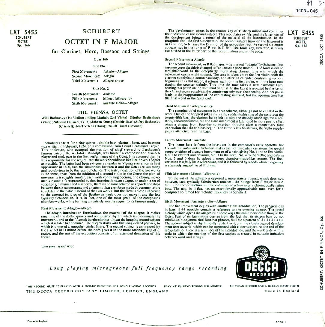 商品詳細:全く同一メンバーでの全3回録音中の1958年3月の2回目録音。メンバーは、ウィリー・ボスコフスキー(第1ヴァイオリン)、フィリップ・マタイス(第2ヴァイオリン)、ギュンター・ブライテンバッハ(ヴィオラ)、ニコラウス・ヒュープナー(チェロ)、ヨハン・クルンプ(コントラバス)、アルフレート・ボスコフスキー(クラリネット)、ヨーゼフ・ヴェレバ(ホルン)、ルドルフ・ハンツル(ファゴット)というウィーン八重奏団の中でも黄金期ともいうべきメンバーが揃う(初代メンバーと思われる)。ミニ・ウィーンpo.のような様相。シューベルトの八重奏曲は弦と管の両方が入った円熟期の作品。規模が大きくシンフォニックな性格を持つ。ウィーン八重奏団の演奏はモノラル/ステレオどちらにしても、しっとりとしたウィーンの雰囲気を濃厚に湛えた名演であり、これ以上の演奏を探すのは難しいだろう。同時発売のステレオSXL 2028は高額。ご存じDECCAのLXTの音質は文句なしに良い。この時期モノラルは完全に熟成したかのような音質を誇る!ウィーン八重奏団は1948年にシューベルトの八重奏曲を演奏する目的で創設されたと聞いたことがある。この8人という数が絶妙で大抵の室内楽が演奏可能となる。足りない場合はいつでもウィーンpo.から応援を呼べるので、演奏不可能な室内楽は存在しないと言える。シューベルトの五重奏曲『鱒』等もピアニストを招いて演奏が可能。『鱒』も彼らの重要なレパートリーとなっている。ベートーヴェンの七重奏曲(1948年/1954年/1959年)、シューベルトの八重奏曲(1948年/1954年/1958年)はそれぞれ3つの録音があるほど、メインのレパートリーである。同様の編成の団体とは比べるまでもなく圧倒的なクオリティーを誇る団体!これはモノラル盤だが完全に熟成したモノラルの芳醇なサウンドが楽しめる。ステレオが本当に必要なのか疑いたくなるほど!