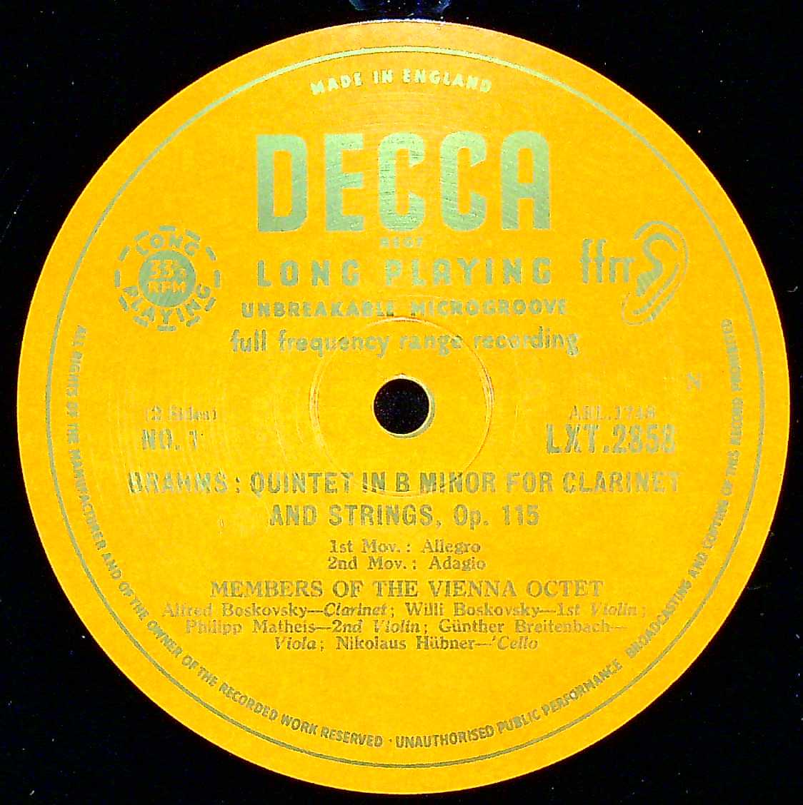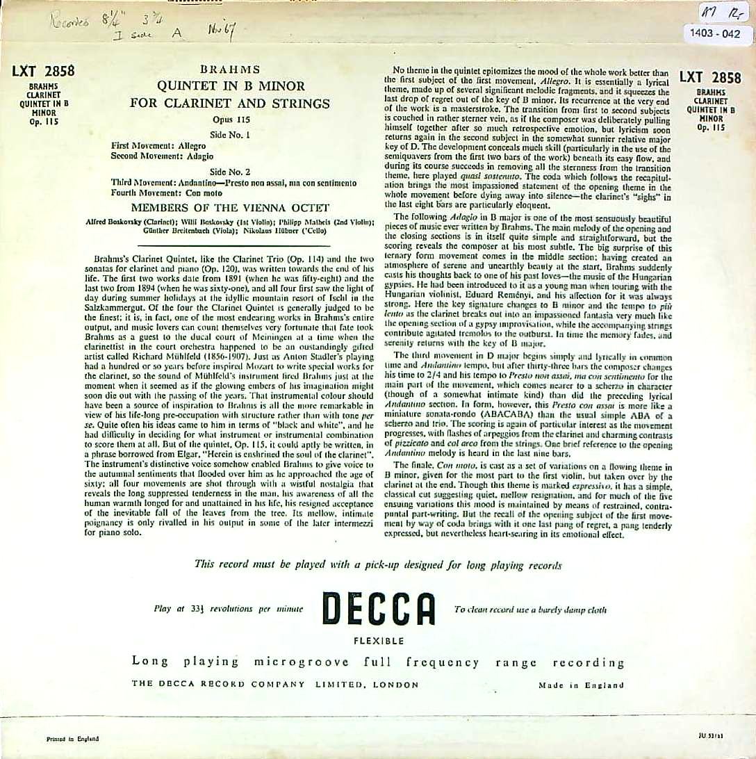 商品コード:1403-042[DECCA] ウィーン八重奏団メンバー / ブラームス:Cl五重奏曲Op.115