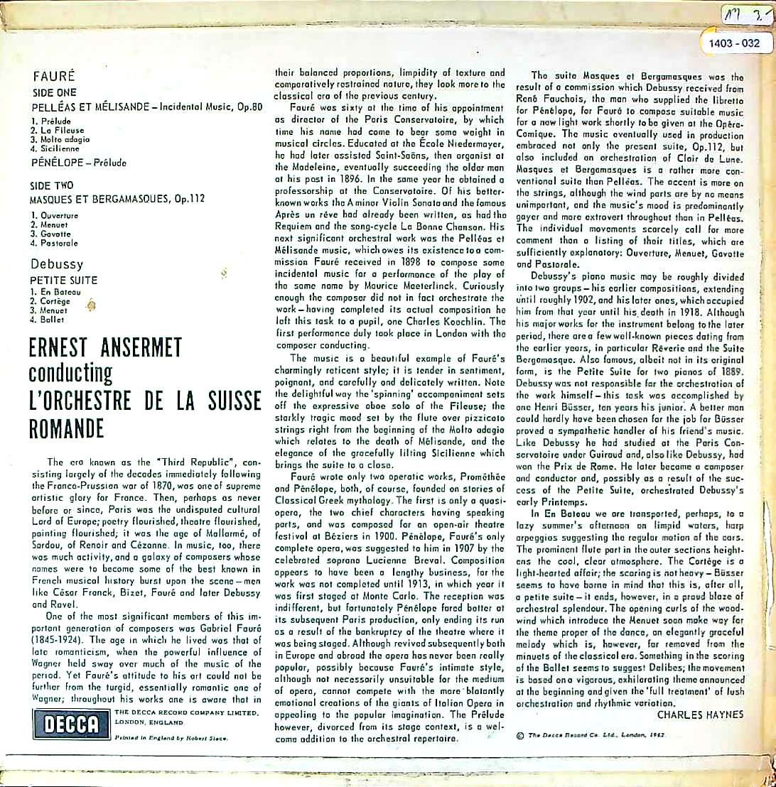 商品コード:1403-032n[DECCA] E.アンセルメ / フォーレ:ペレアスとメリザンドOp.80, ペネロープ前奏曲, フォーレ:マスクとベルガマスクOp.112, ドビュッシー:小組曲