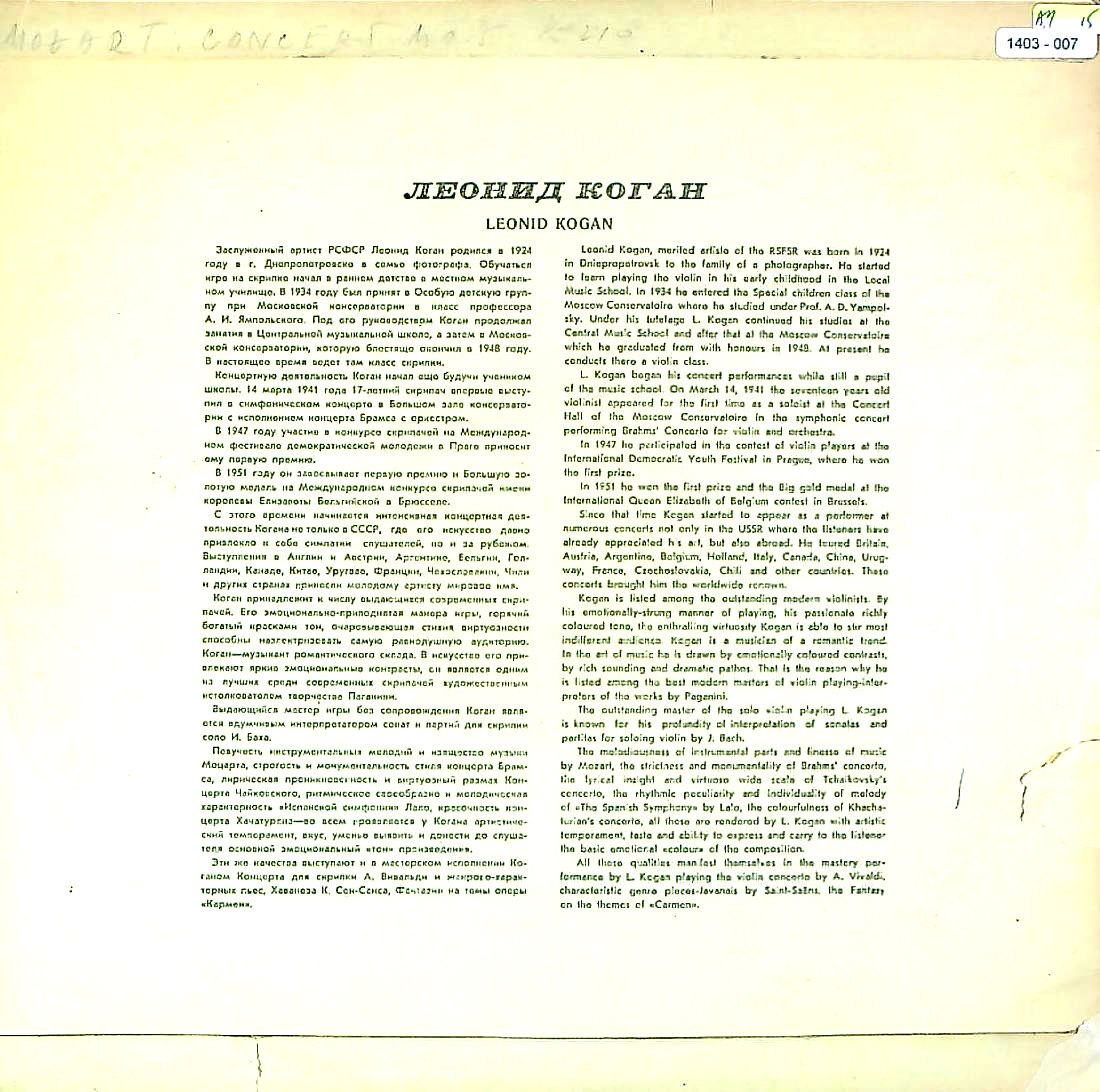 商品コード:1403-007n[MELODIYA] L.コーガン(vn) / モーツァルト:Vn協奏曲5番K.219, ラヴェル:ツィガーヌ