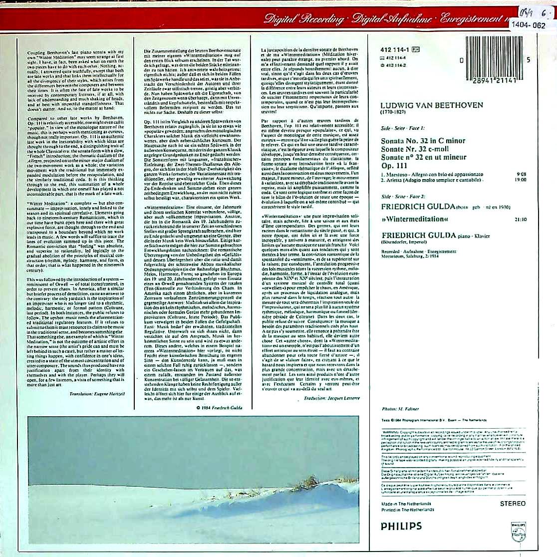 商品コード:1404-062[PHILIPS] F.グルダ(pf) / ベートーヴェン:Pfソナタ32番Op.111, グルダ:冬の瞑想
