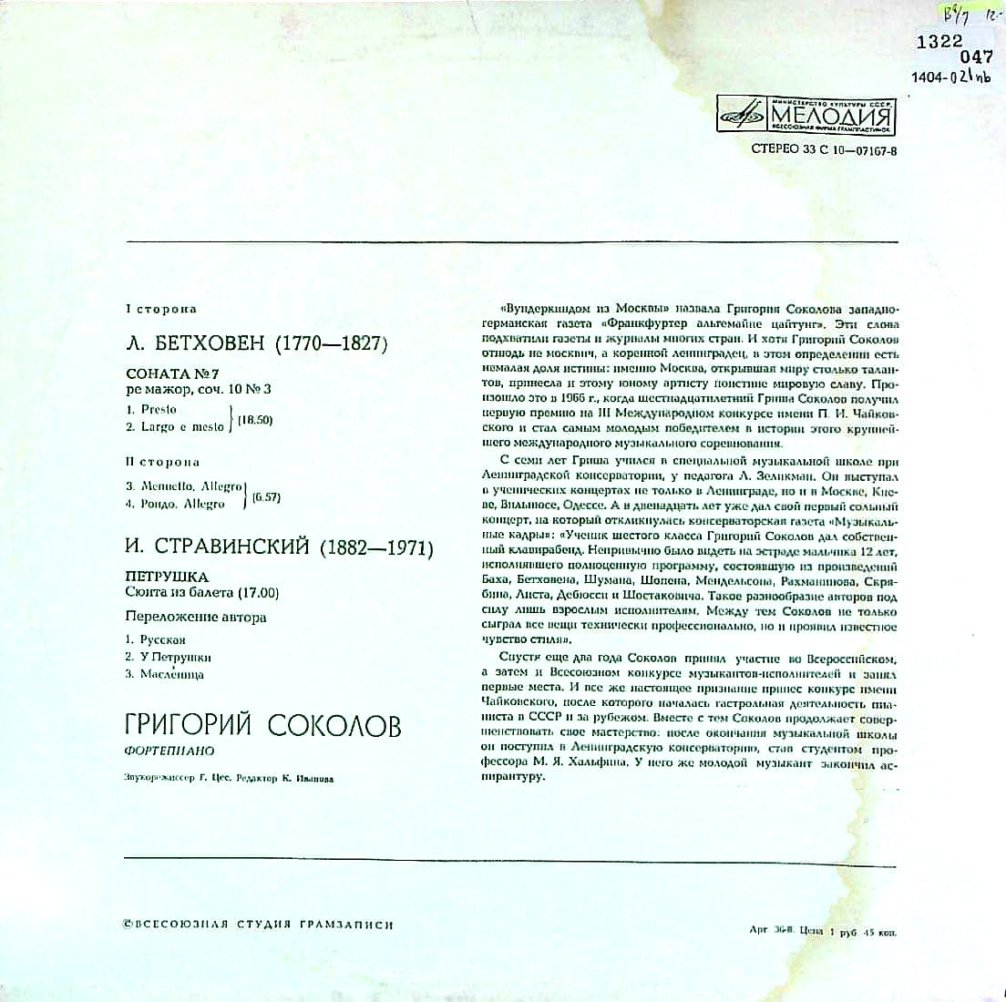 商品コード:1404-021nb[MELODIYA] G.ソコロフ(pf) / ベートーヴェン:Pfソナタ7番, ストラヴィンスキー:ペトルーシュカからの3楽章