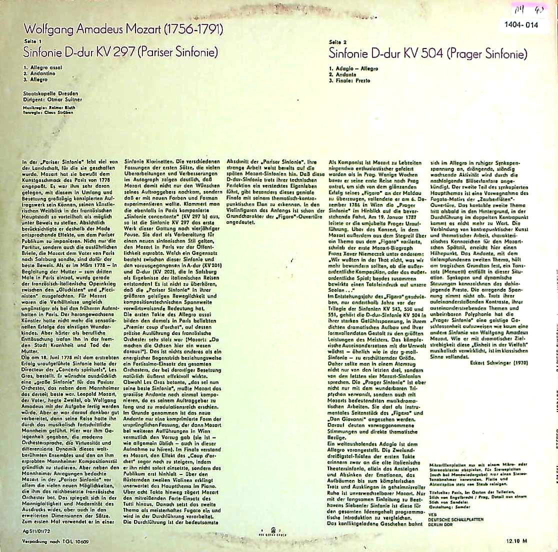 商品コード:1404-014t[ETERNA] O.スウィトナー/ モーツァルト:交響曲31番K.297「パリ」, 交響曲38番K.504「プラハ」