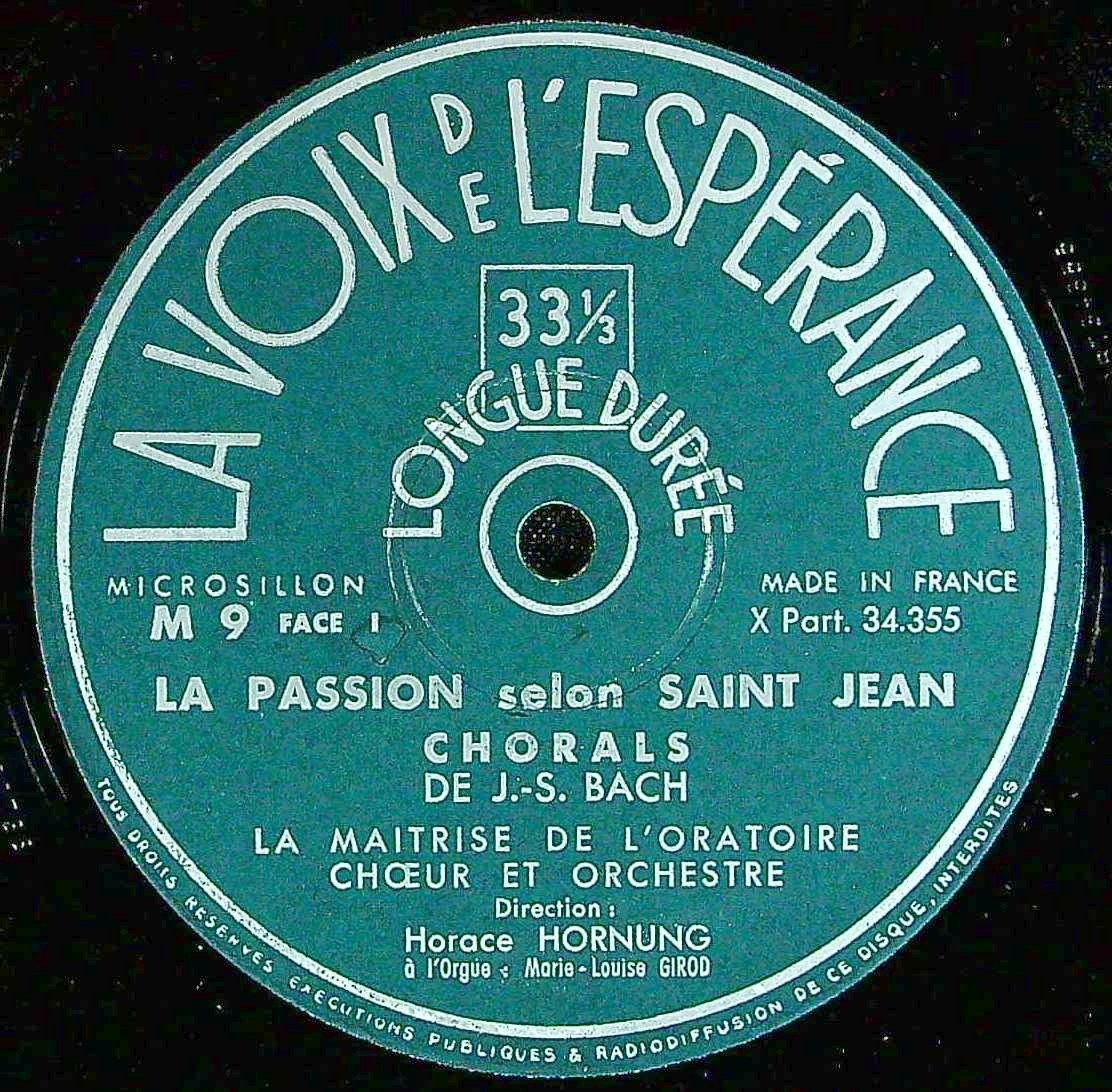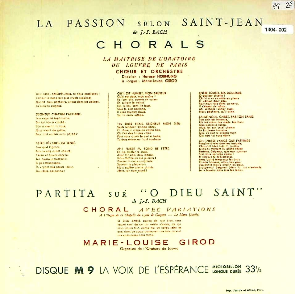 商品詳細:1950年代初期のフランスでの古い録音。指揮者オラス・オーノン(1907-1996)は、パリ・コンセール・パドルーo.の指揮者であり、またパリ・ルーブル美術館礼拝堂マスターズo.及びその合唱団の指揮者である。ルーブル美術館は現在でこそ美術館として知られるが、建物は元カトリック教会であり、フランス礼拝堂の本拠地であり、 1624年にルイ13世によってルーブル宮殿の王室礼拝堂として建てられた経緯がある。王室礼拝堂の時代では専属のオーケストラ及びその合唱団が古くから存在していた。現在も残っているかは不明だが、当時存在していた。ドイツでバッハを歌っていて英国より早い時期にドイツ語によるバッハ演奏が行われていたようである。A面にヨハネ受難曲から合唱曲だけ9曲を演奏。フランス語の曲目しかなく、然も現代の題目とは異なるようで、どの曲であるか不明である。B面はマリー・ルイ・ジローのオルガン・ソロによる「オルガンのためのパルティータ『おお、汝正しくて善なる神よ』B.767」が1曲入る。いかにも古い時代のLPである。B面のオルガン曲はフランス・サルト県ル・マンにある男子高校の礼拝殿にあるオルガンを使っての録音らしい。ル・マンは24時間耐久レースで知られるフランスの西部に位置する都市である。オルガン奏者のマリー・ルイ・ジローはルーブル美術館礼拝堂専属のオルガン奏者。何故ル・マンまで来て録音したのかは不明。パリ・ルーブル美術館礼拝堂合唱団の演奏は過去に殆ど入荷がなく非常に珍しい録音といえる。またレーベルのLa Voix de l'Espéranceは当社でもこの1種しか入荷のないSPがメインのマイナーレーベルで、LPも7インチ、10インチを主体とした宗教作品が10点ほどしか出ていない珍しいレーベルである。