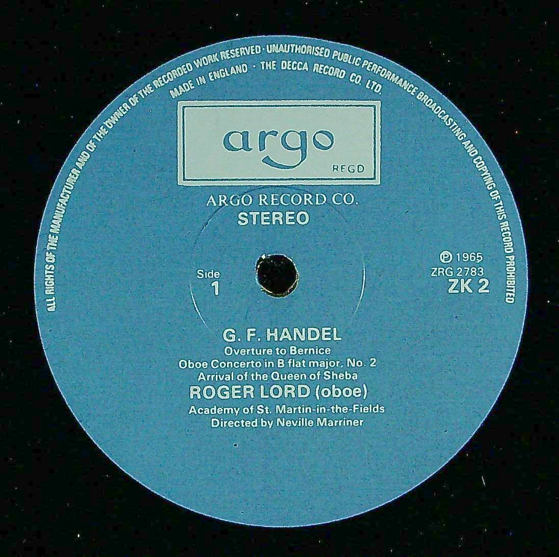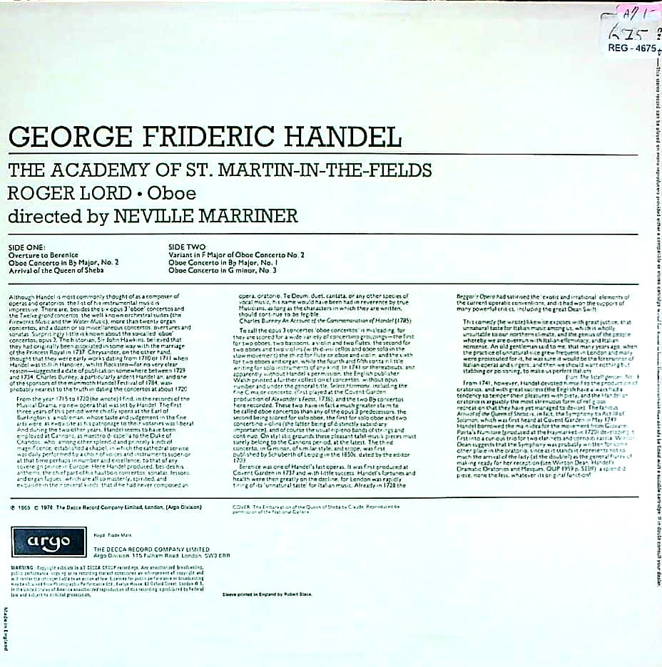 商品コード:REG-4675t[英ARGO] R.ロード(ob)/ ヘンデル:「ベレニーチェ」序曲, オラトリオ「ソロモン」~シバの女王の入城, Ob協奏曲1~3番(2番は移調版も)